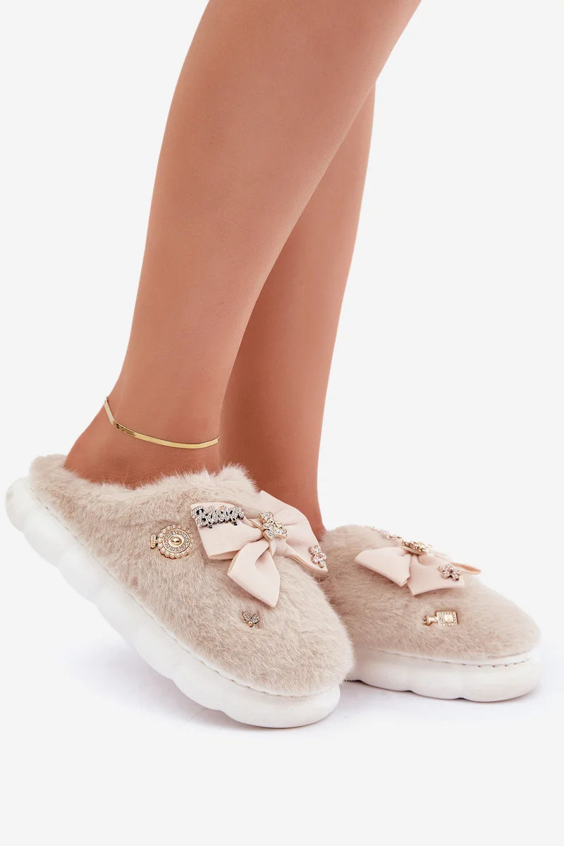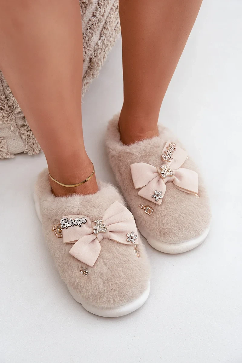 Futrzané Pantofle S Mašlí A Brožemi Béžové Annalira