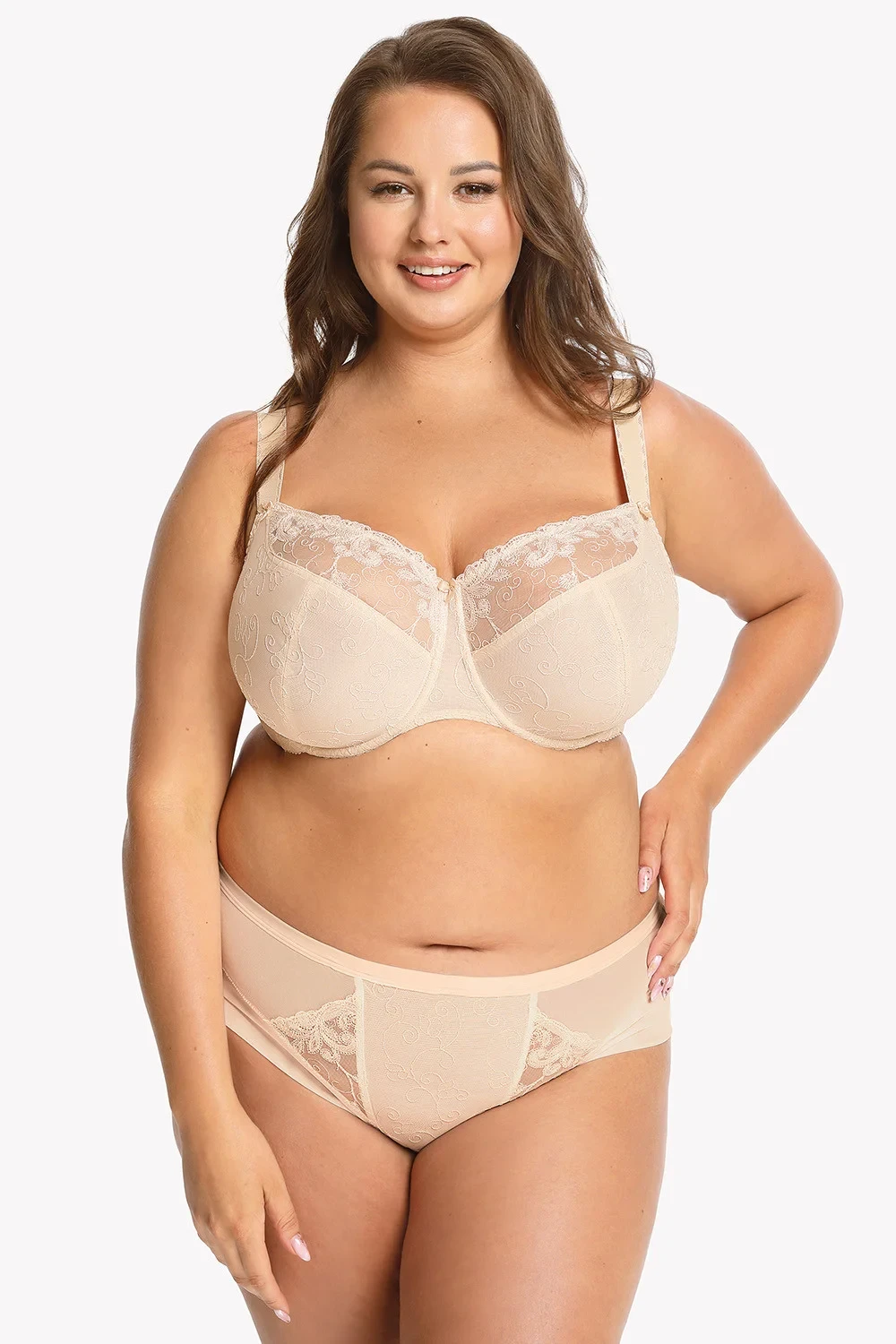 Podprsenka Gaia. Model 1027M Eve Maxi. Má dráty, které prsa vhodně tvarují. Svislé velrybí kosti zasazené po stranách. Výrobek má nastavitelné popruhy bez možnosti odepnutí. Kovové háčky na popruh. Podprsenka se zapínáním na háčky a oči. Upevňovací bod: vzadu. Výrobek je vyroben z 56 % z polyamidu, 30 % z polyesteru a 14 % z elastanu. Výrobek pro ženy.