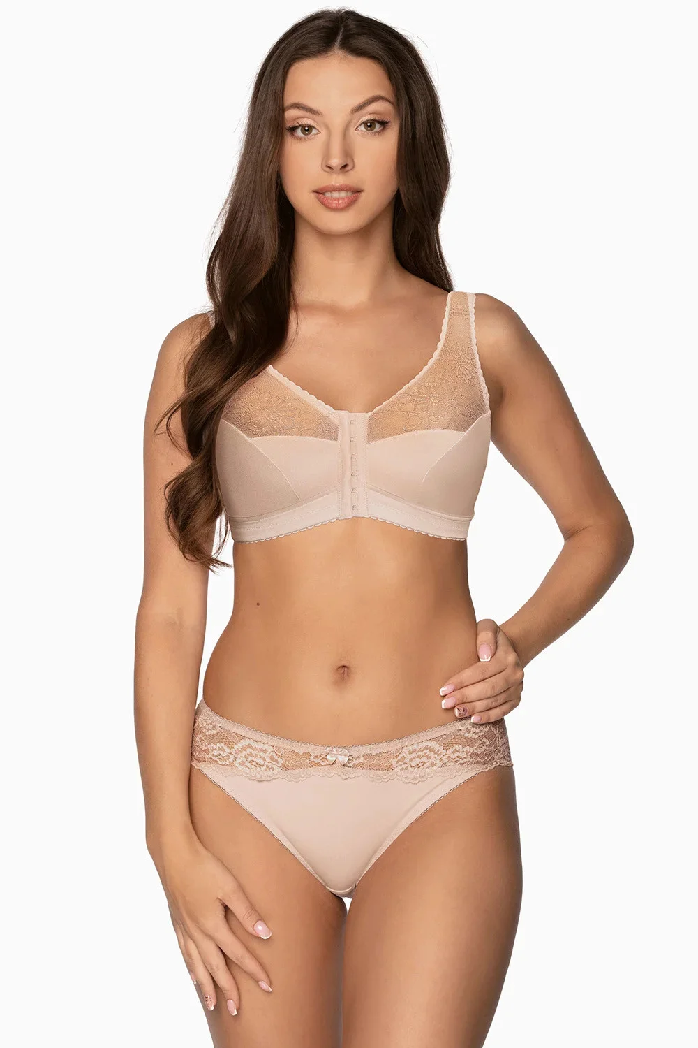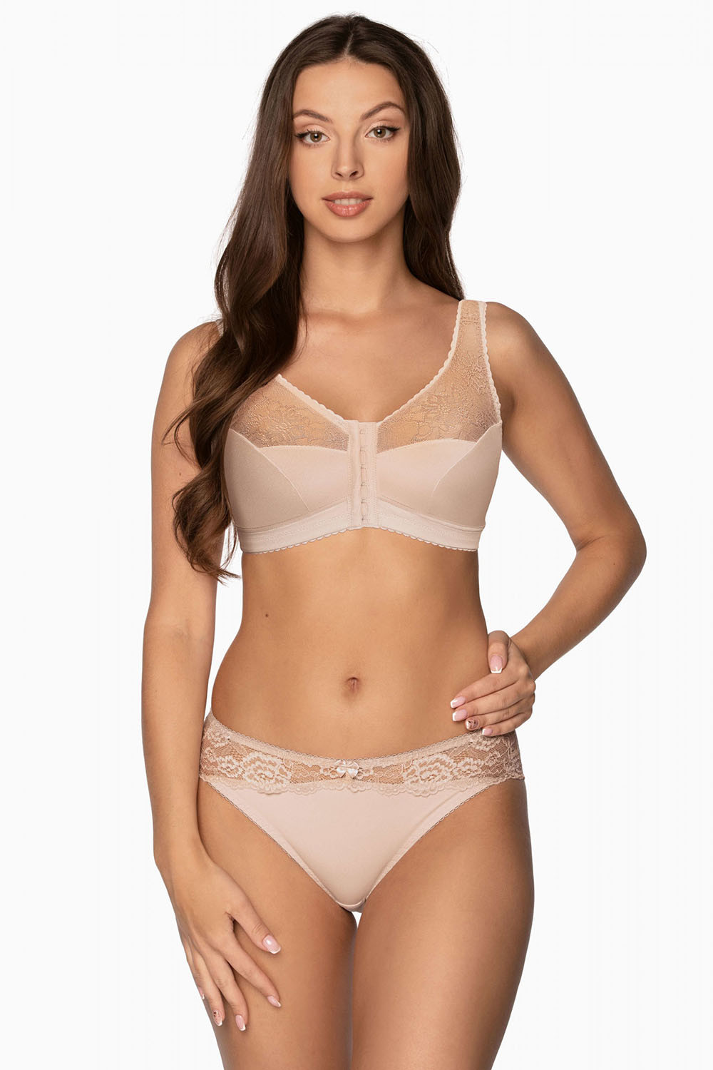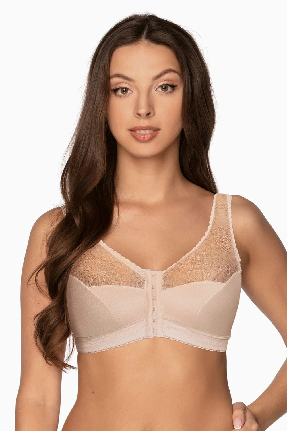 Podprsenka Gaia. Model 1163 Rachela. Výrobek má nastavitelné popruhy bez možnosti odepnutí. Kovové háčky na popruh. Podprsenka se zapínáním na háčky a oči. Zapínání: vpředu. Výrobek je vyroben z 85 % z polyamidu a 15 % z elastanu. Výrobek pro ženy.