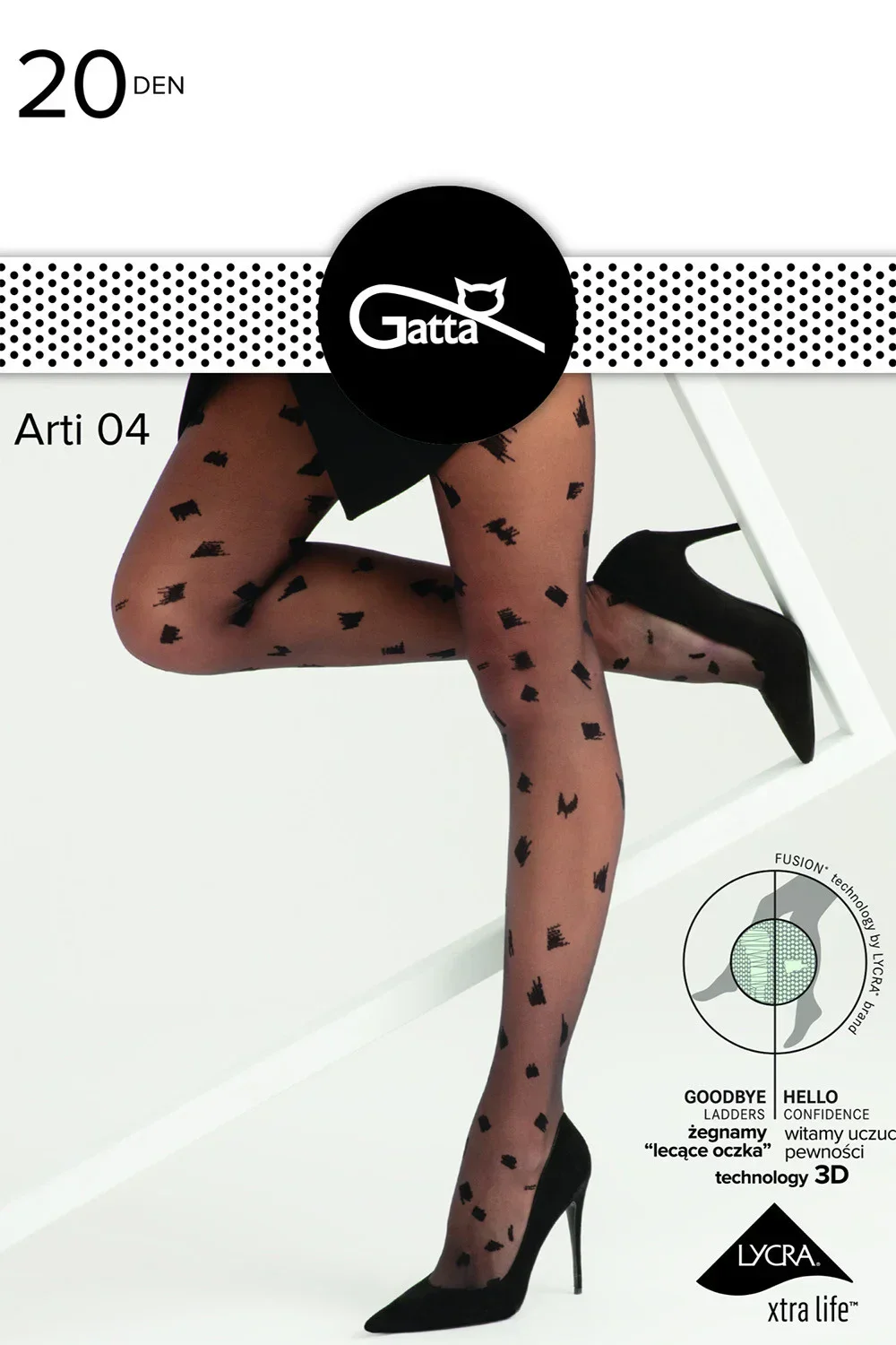 Punčochové zboží značky Gatta. Model Arti 04 20 DEN. Výrobek je vyroben z 81 % z polyamidu a 19 % z elastanu. Výrobek pro ženy. Tloušťka: 20 denierů. Žádné označené prsty. Žádné označené kalhotky.