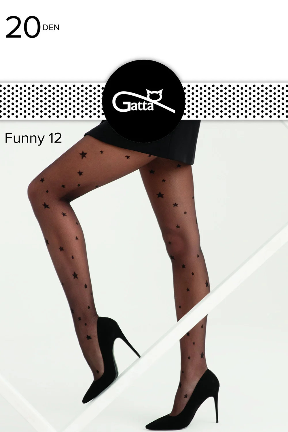 Punčochové zboží značky Gatta. Model Funny 12 20 DEN. Výrobek je vyroben z 87 % z polyamidu a 13 % z elastanu. Výrobek pro ženy. Tloušťka: 20 denierů. S označenými prsty. Označená sekce kalhotek.