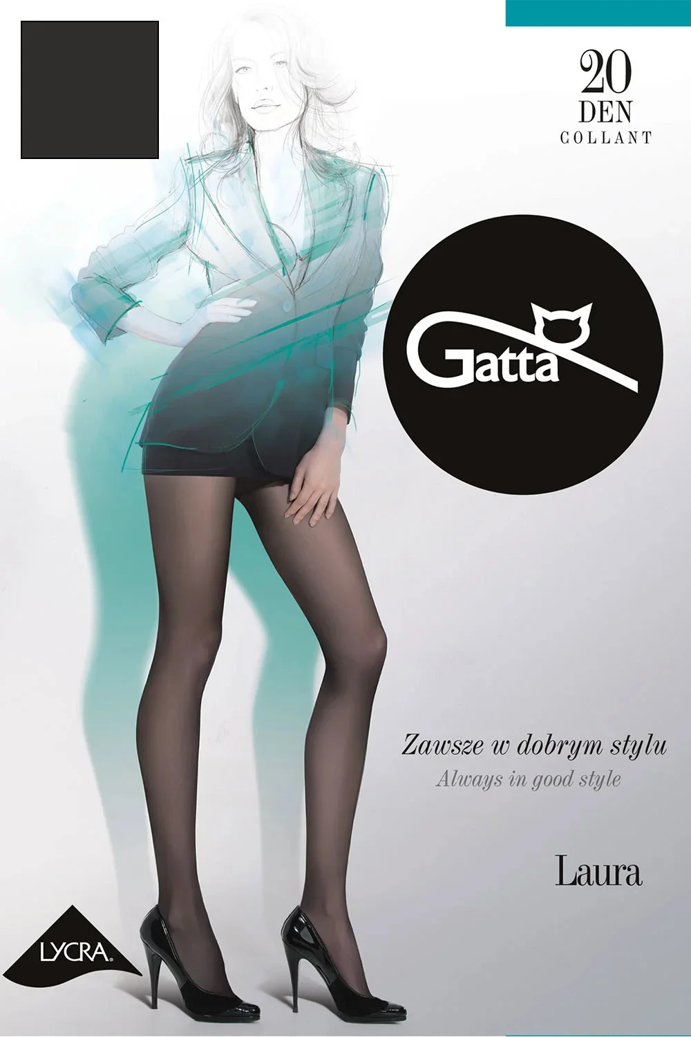 Punčochové zboží značky Gatta. Model Laura 20. Výrobek je vyroben z 90 % z polyamidu a 10 % z elastanu. Výrobek pro ženy. Tloušťka: 20 denierů.