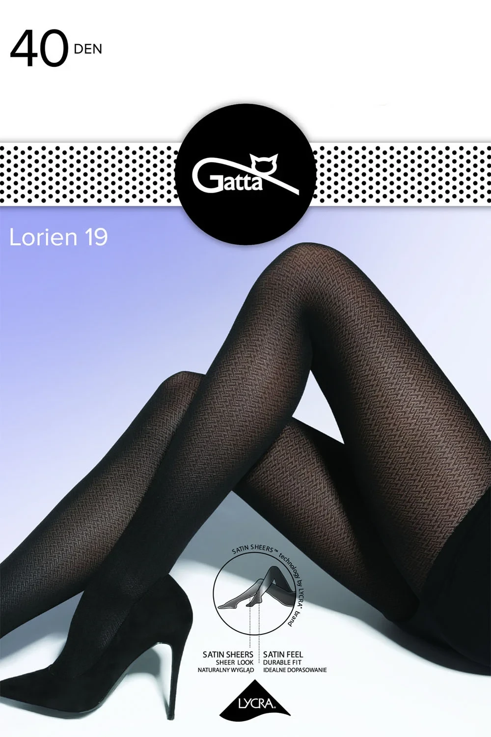 Punčochové zboží značky Gatta. Lorien Model 19. Výrobek je vyroben z 90 % z polyamidu a 10 % z elastanu. Výrobek pro ženy. Tloušťka: 40 DEN. Žádné označené prsty. Označená sekce kalhotek.
