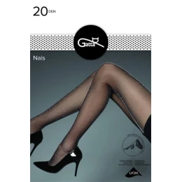 Punčochové zboží značky Gatta, model Nais, vyrobené z 69% polyamidu, 4% metalizované příze, 27% elastanu, bez vyznačených špiček, 20 DEN, dámské, bez vyznačených nohaviček.