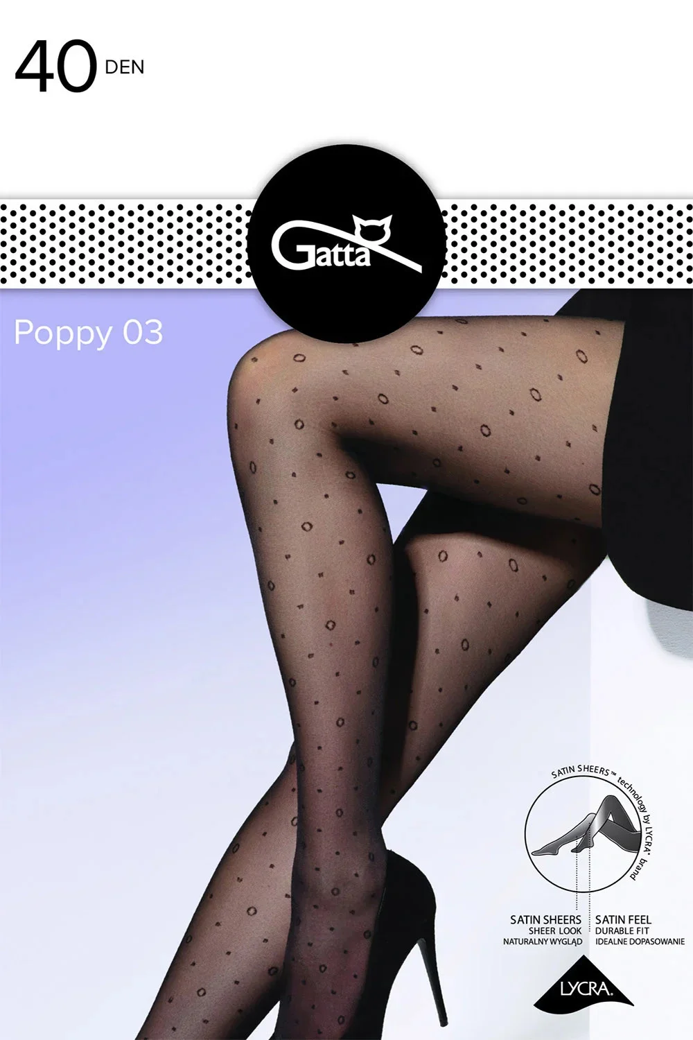 Punčochové zboží značky Gatta, model Poppy 03, vyrobené z 93% polyamidu, 7% elastanu, bez vyznačených špiček, tloušťka 40 DEN, bez vyznačených nohaviček.