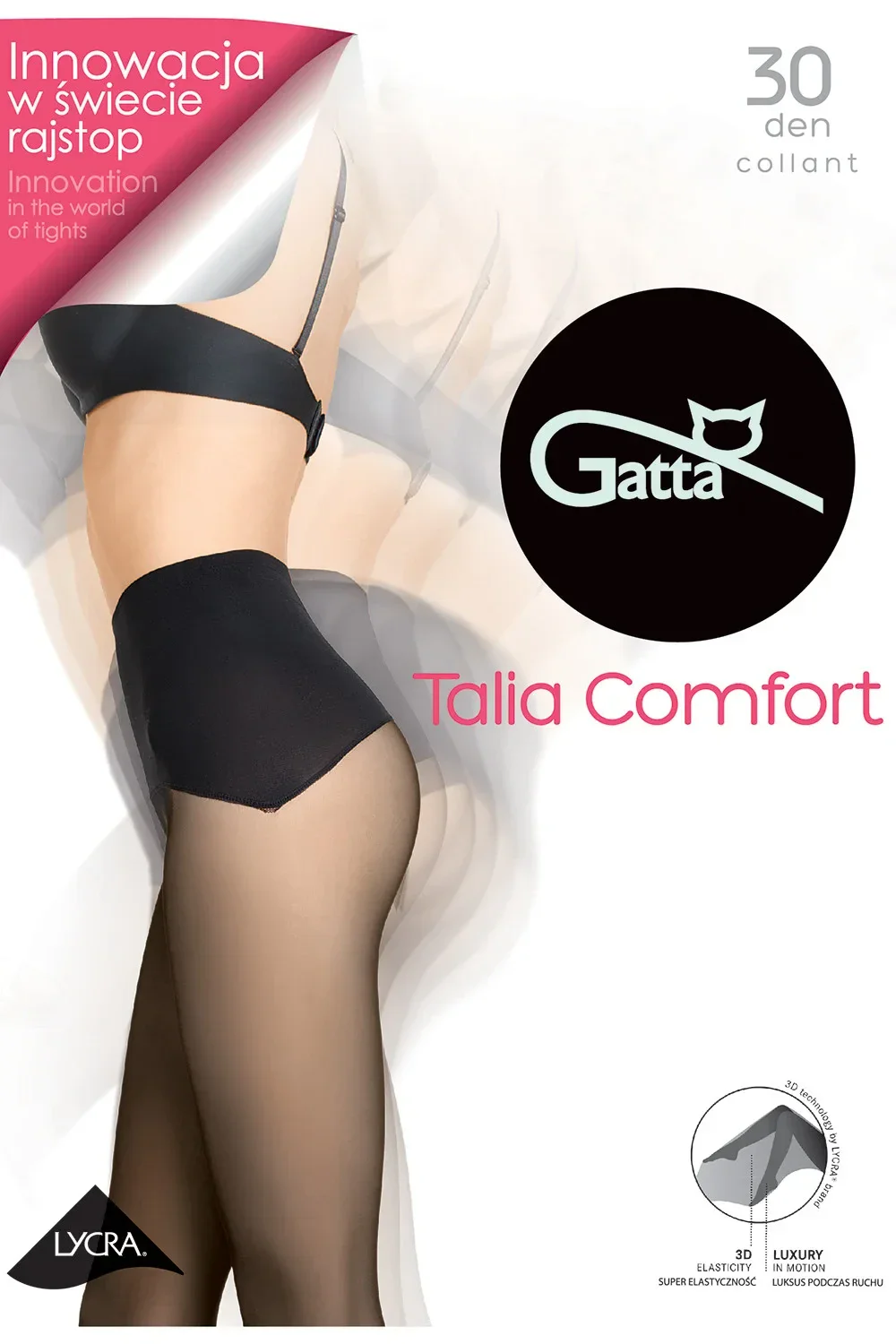 Punčochové zboží značky Gatta, model Talia Comfort, vyrobeno ze 72 % polyamidu, 28 % elastanu. Vlastnosti výrobku: pohodlná lehkost, bez vyznačených prstů, tloušťka: 30 DEN, dámský výrobek.