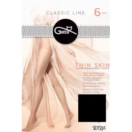 Punčochové zboží značky Gatta, model Thin Skin. Výrobek je vyroben z 63 % polyamidu, 37 % elastanu. Vlastnosti výrobku: ultra tenké prosvětlující lehké vzdušné. bez vyznačených špiček. tloušťka: 6 DEN. dámský výrobek. označené kalhotky.