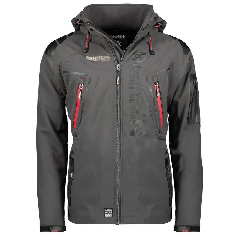 Objevte pánskou softshellovou bundu "Techno" značky Geographical Norway. Tato ikonická bunda má odepínací kapuci se stahovacími šňůrkami, kapsy na zip, PVC stahovací šňůrky na manžetách, nášivku na rukávu a různé potisky.