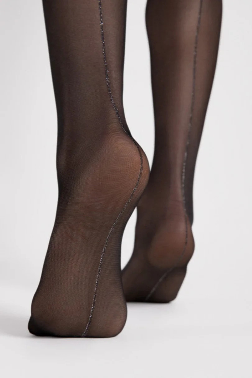 Výjimečně ženské, exkluzivní punčocháče s třpytivým švem na zadní straně. Poskytují pocit elegance a pohodlí při nošení.