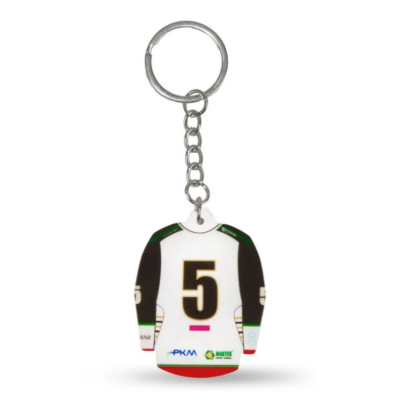 Brelok 'koszulka hokejowa' GKS Tychy (Home) Szukasz praktycznego, a zarazem stylowego gadżetu, który wyrazi Twoje wsparcie dla drużyny GKS Tychy? Brelok w kształcie koszulki hokejowej tego klubu to idealny wybór! To nie tylko funkcjonalny przedmiot codziennego użytku, ale także świetna pamiątka, która doskonale oddaje ducha drużyny. Główne cechy: Design: Brelok wiernie odwzorowuje wygląd oficjalnej koszulki wyjazdowej GKS Tychy, łącząc biały kolor z kontrastowymi, czarnymi rękawami. Taki projekt wyróżnia się elegancją i klasycznym stylem, od razu przyciągając wzrok. Charakterystyczne logo GKS Tychy: Na przedzie koszulki znajduje się duże, rozpoznawalne logo GKS Tychy w trójkątnym kształcie, w barwach zielono-czerwono-złotych. To symbol dumy i tradycji klubu, który każdy fan hokeja zna i ceni. Numer "5" na plecach: Dbałość o detale jest imponująca – na tylnej części breloka widnieje numer "5", elegancko obramowany złotem co dodaje koszulce profesjonalnego charakteru. Logotypy sponsorów i herb miasta Tychy: Brelok nie tylko oddaje wygląd samej koszulki, ale również umieszcza ważne elementy, takie jak logotypy sponsorów oraz herb miasta Tychy, podkreślając związki drużyny z lokalną społecznością. Praktyczność i funkcjonalność: Dzięki solidnej konstrukcji i kompaktowemu rozmiarowi brelok doskonale sprawdzi się jako dodatek do kluczy, plecaka czy torby sportowej. To funkcjonalny gadżet, który jednocześnie pozwala na codzienne manifestowanie swojego przywiązania do ulubionej drużyny. : Ten brelok w kształcie koszulki wyjazdowej GKS Tychy to doskonały gadżet dla każdego wiernego kibica. Jest nie tylko praktyczny, ale również wyjątkowo estetyczny – idealny do przypięcia do kluczy, torby czy plecaka.