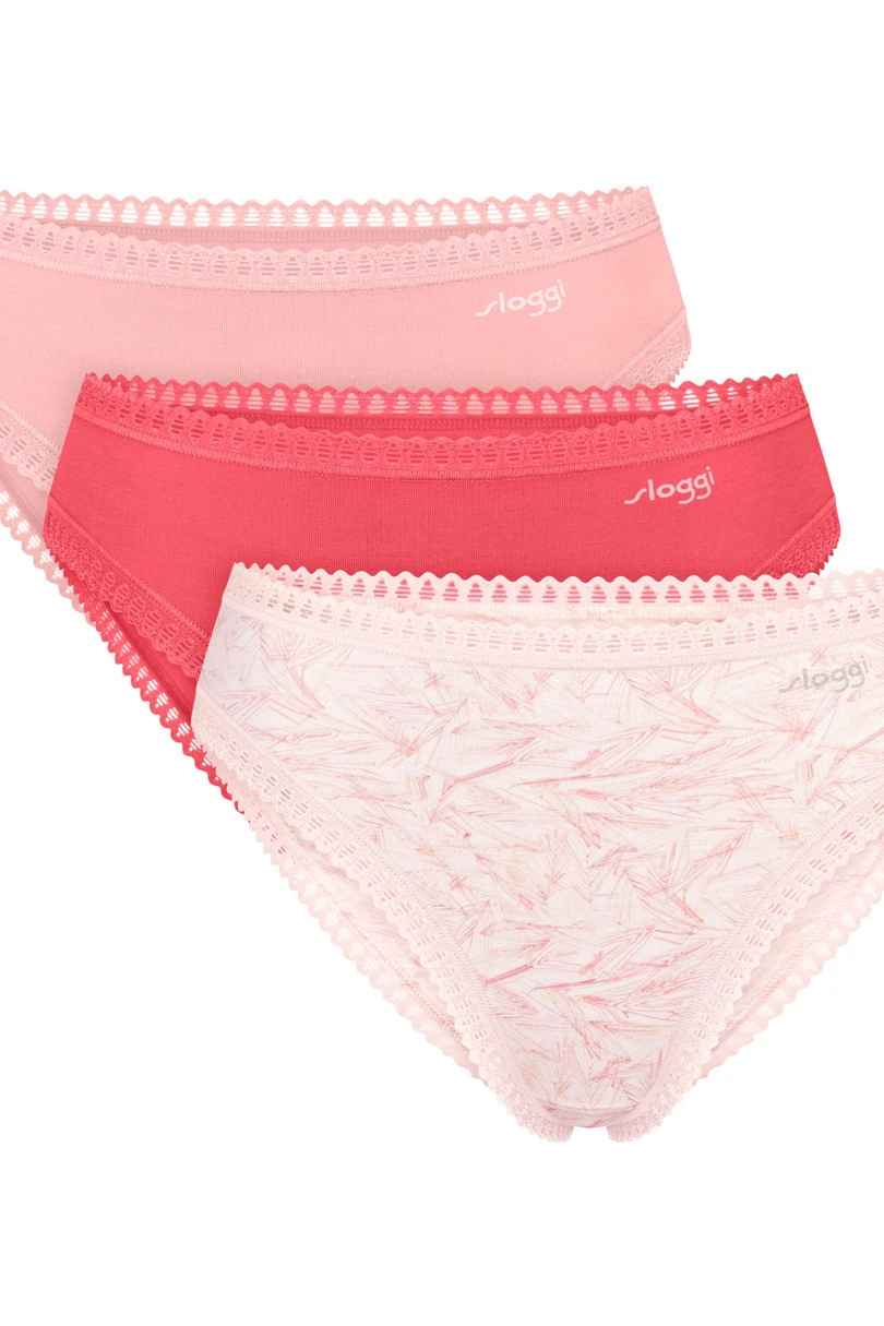 Damskie figi Sloggi w praktycznym zestawie 3-pak to idealny wybór na co dzień dla kobiet ceniących komfort i wysoką jakość bielizny. W komplecie znajdują się trzy pary fig w harmonijnej kolorystyce: jasny róż, intensywna czerwień oraz model z subtelnym, delikatnym wzorem.