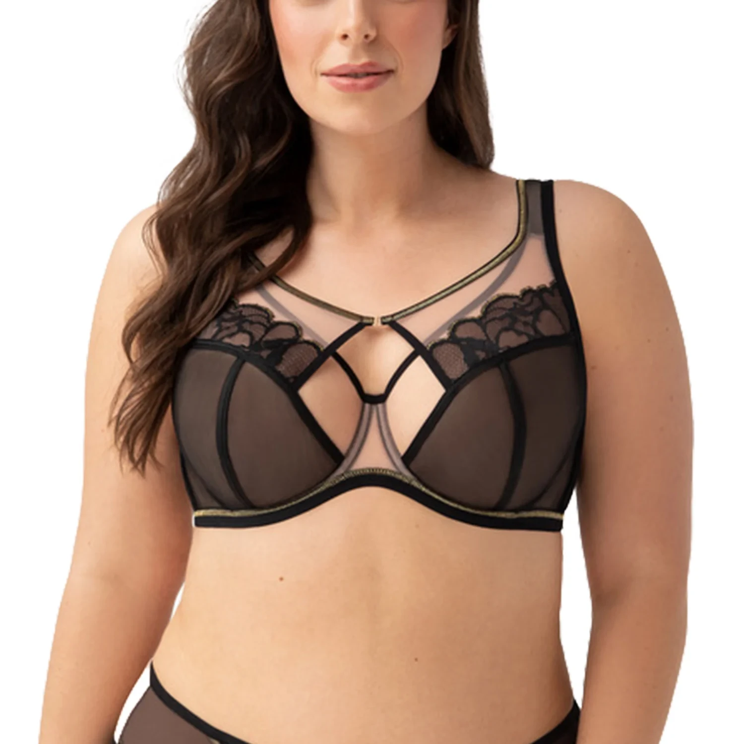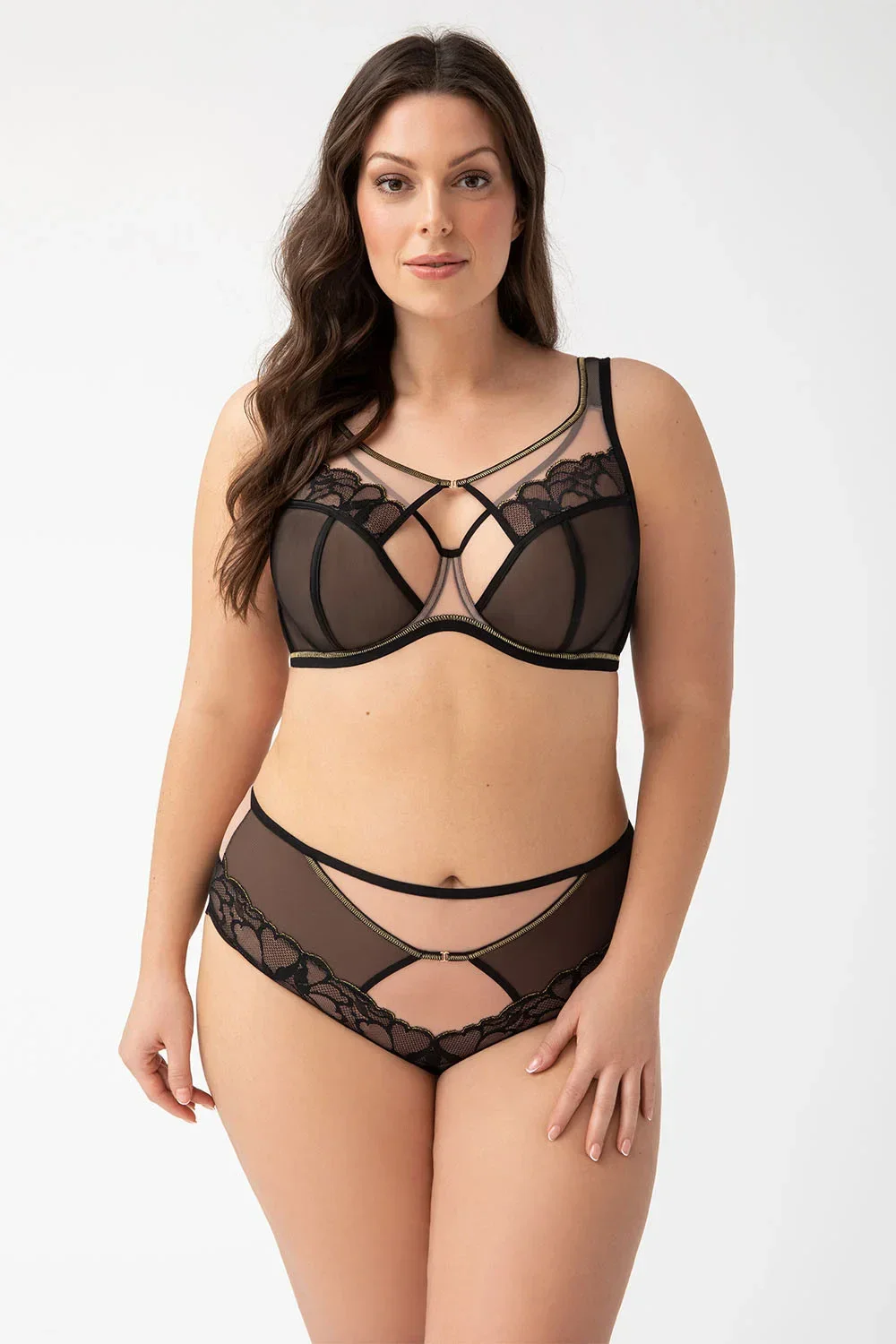 Podprsenka od Gorsenia. Model K758 Saanvi. Má dráty, které prsa vhodně tvarují. Svislé velrybí kosti zasazené po stranách. Výrobek má nastavitelné popruhy bez možnosti odepnutí. Kovové háčky na popruh. Podprsenka se zapínáním na háčky a oči. Upevňovací bod: vzadu. Výrobek je vyroben z 90 % z polyamidu, 7 % z elastanu a 3 % z polyesteru. Výrobek pro ženy.