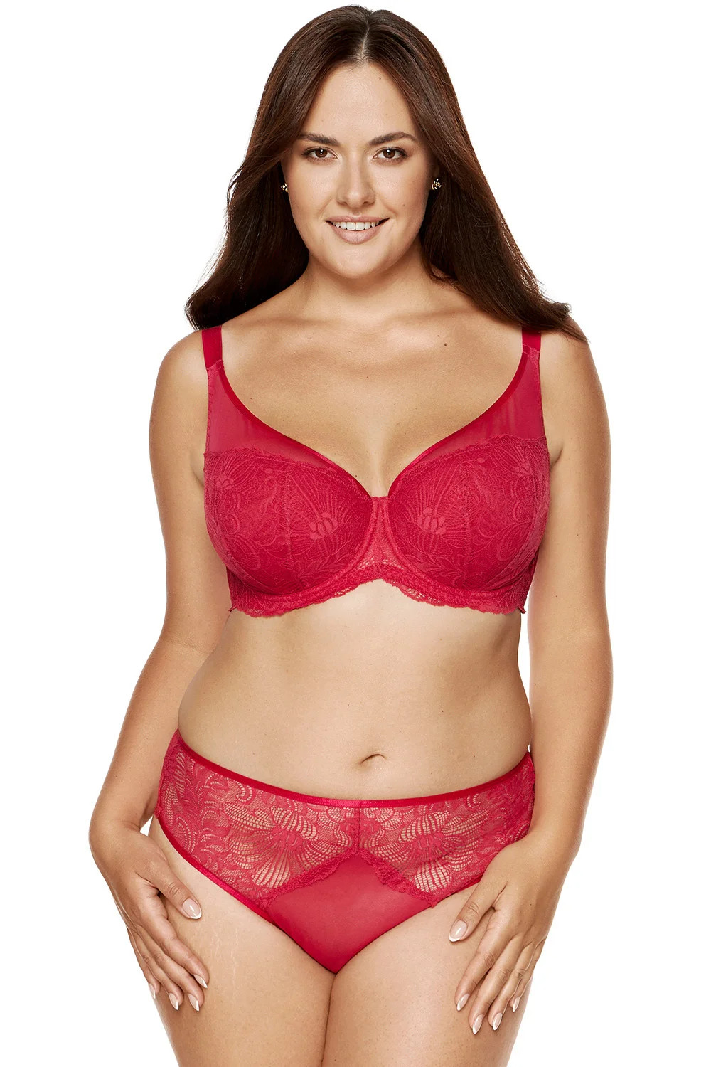 Podprsenka značky Gorteks, model Rouge/B4, má drátky, které podpírají a tvarují prsa, svislé kostice na bocích, nastavitelná ramínka bez možnosti odepnutí, kovové háčky na ramínkách, zapínání na háčky a očka, zapínání na zádech, vyrobená z 65 % polyamidu, 20 % polyesteru, 10 % bavlny, 5 % elastanu, vhodná pro ženy.