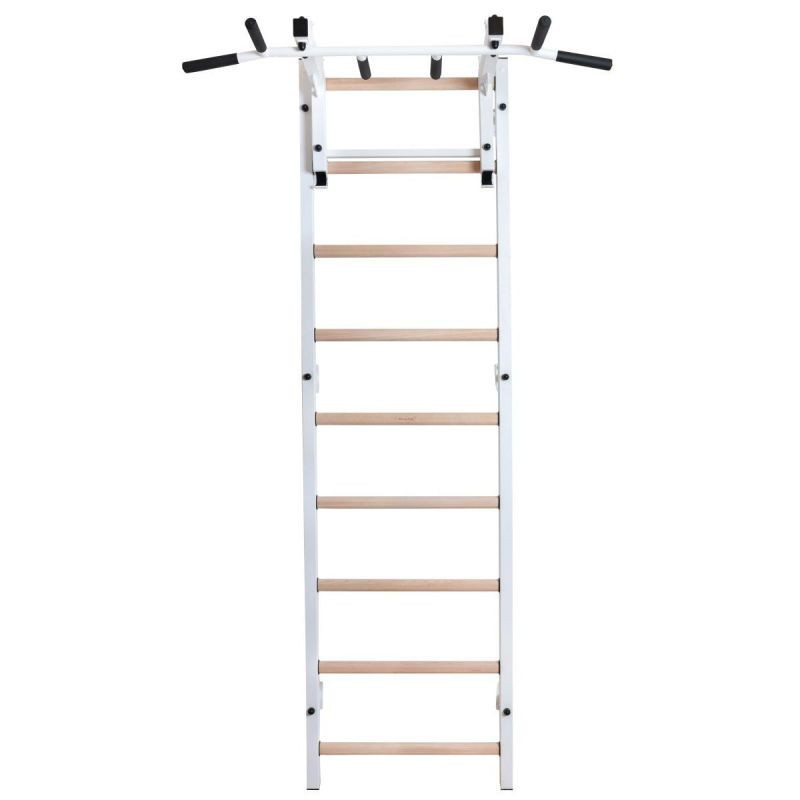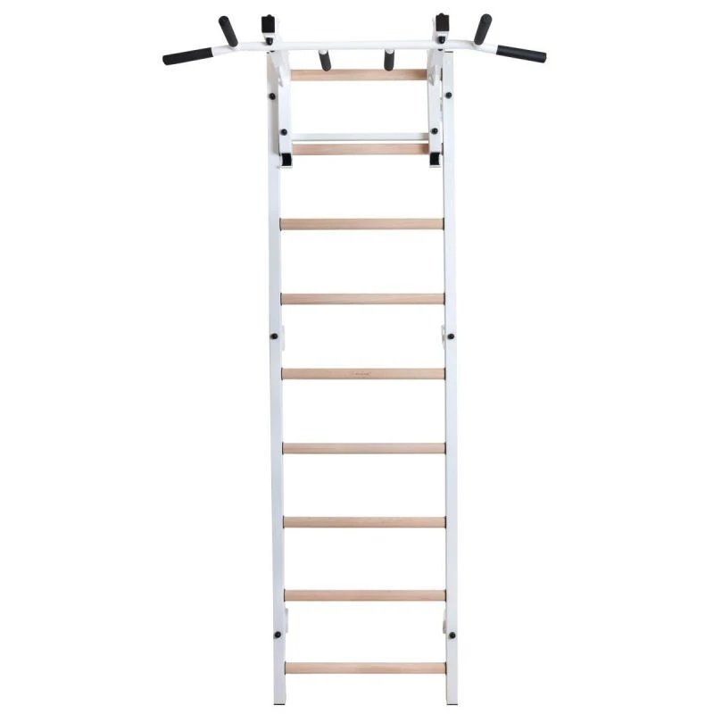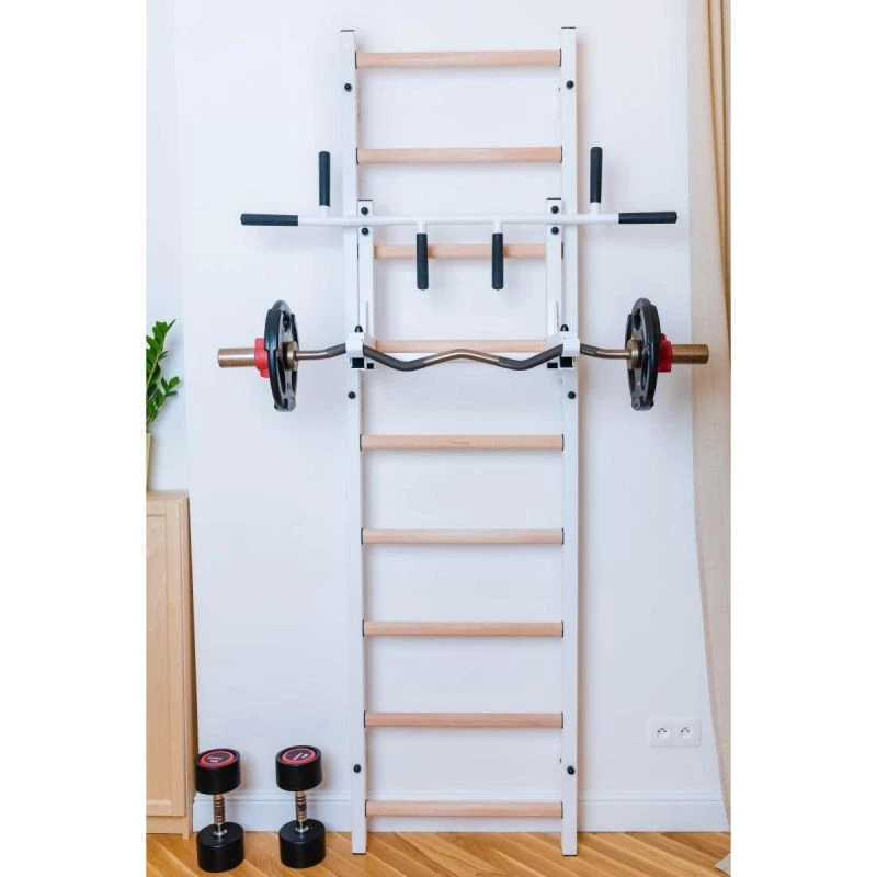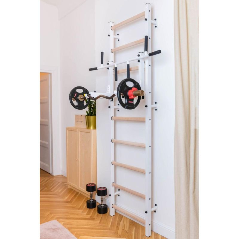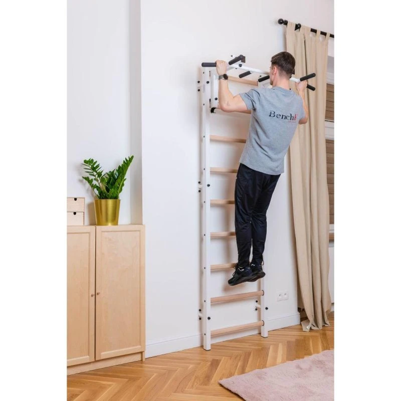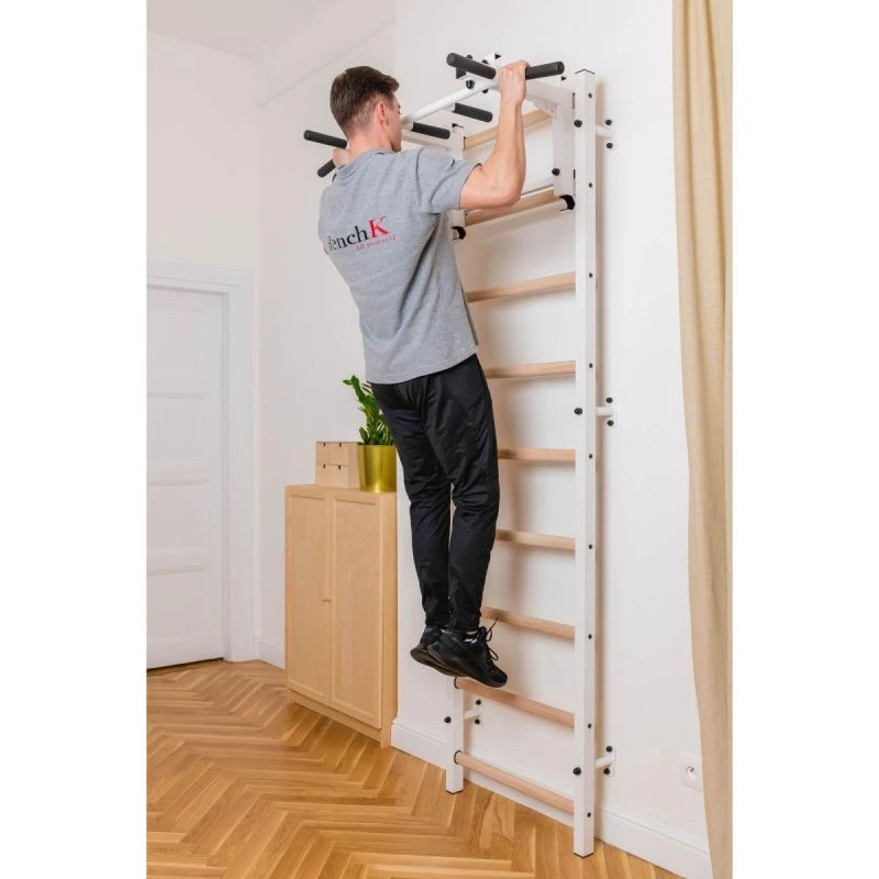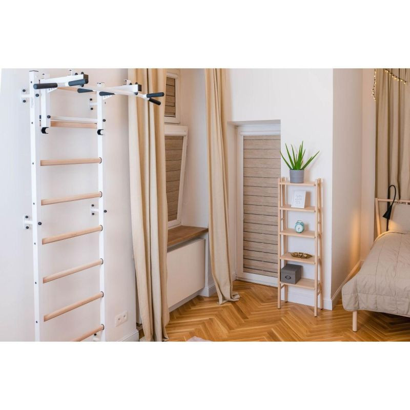 Drabinka gimnastyczna z regulowanym drążkiem to model, który idealnie pasuje do skandynawskiego stylu wnętrz. Pionowe profile (40mm x 50 mm) wykonane są z wysokiej jakości metalu pomalowanego proszkowo. Szczebelki są wykonane z buku o owalnym kształcie, powierzchnia szczebelków jestb olejowana ręcznie, to wszystko wpływa na to, że użytkowanie drabinki jest komfortowe. W górnej części drabinki znajduje się zdejmowany metalowy drążek do podciągania, który wyposażony jest w 6 różnych rączek pozwalających pracować nad siłą mięśni ramion i pleców za pomocą różnych chwytów, np. chwytem szerokim. Drabinka stworzona została z myślą o osobach, które chcą pracować nad swoją sylwetką w zaciszu swojego domu. Drabinka pozwala wykonywać wiele różnorodnych ćwiczeń, nie zajmując przy tym dużo miejsca. Design przemyślano tak, aby pasował do aktualnych trendów w aranżacji wnętrz, nie zaburzając ogólnego wystroju mieszkania. Jedna osoba dorosła może zmienićregulacj