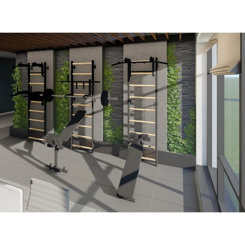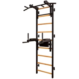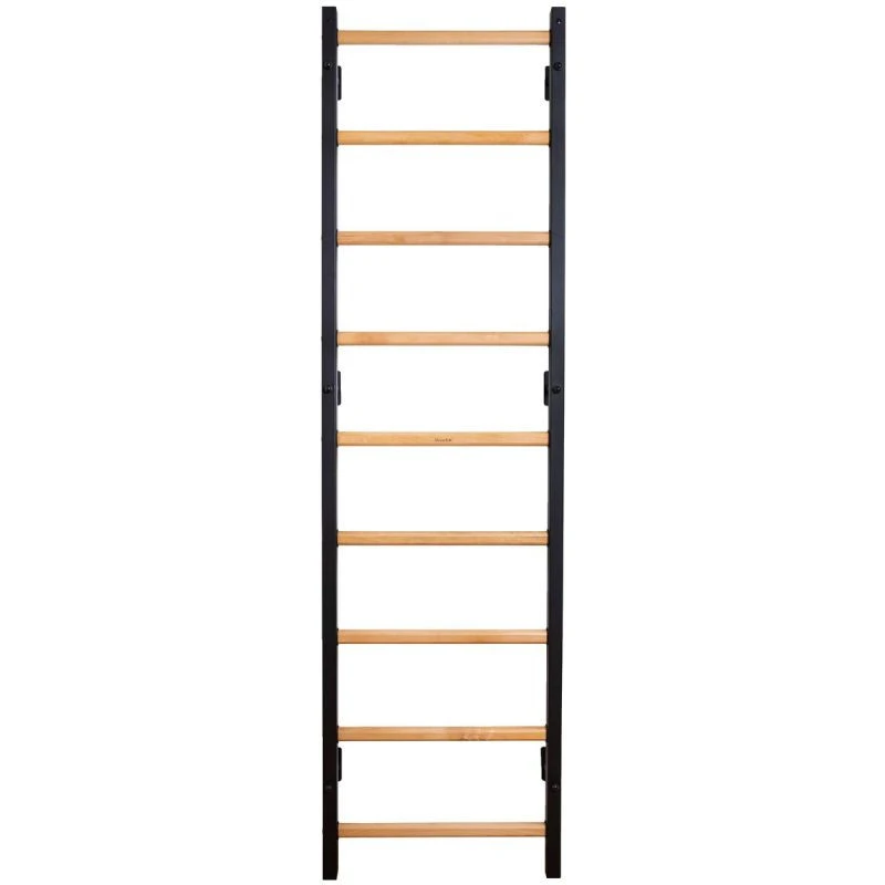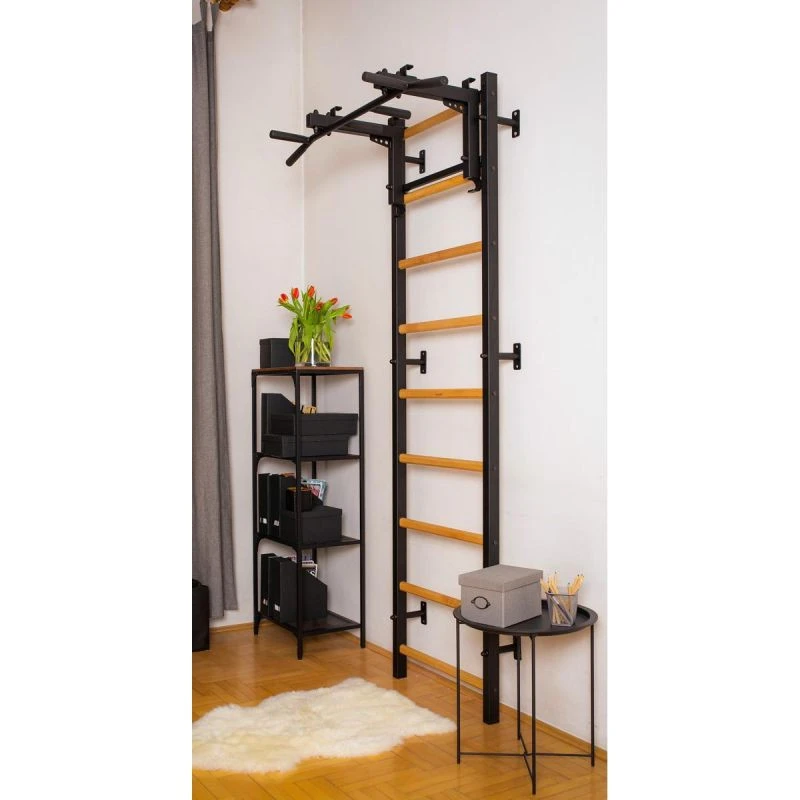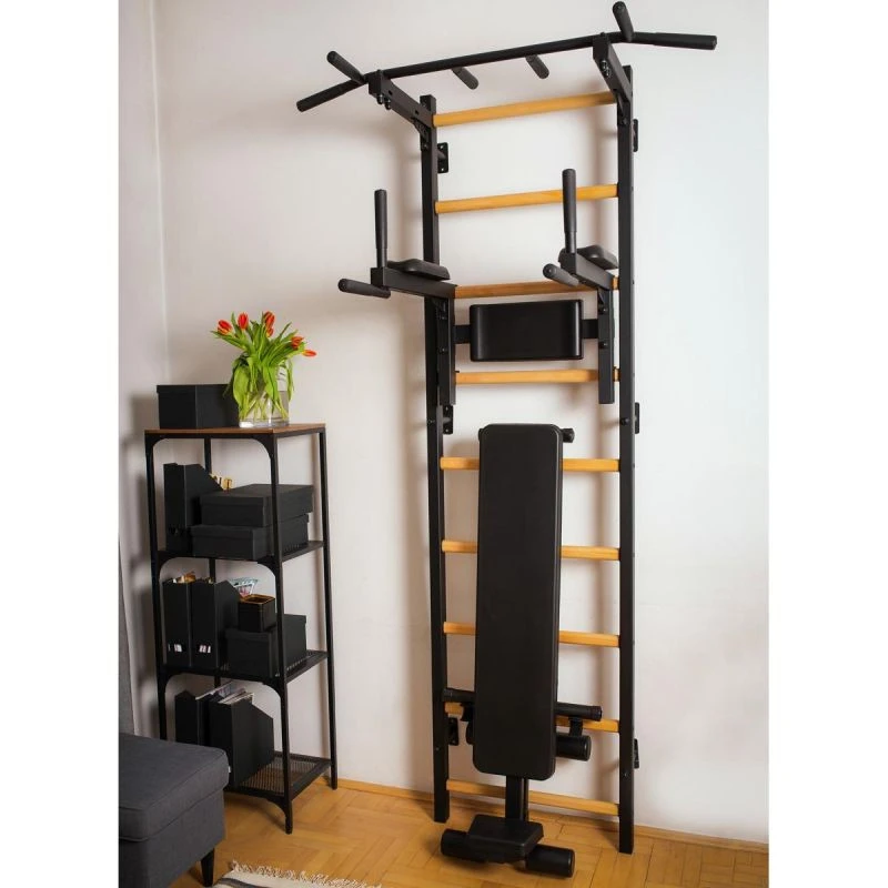 Drabinka gimnastyczna z regulowanym drążkiem oraz poręczą to model, który idealnie pasuje do skandynawskiego stylu wnętrz. Pionowe profile (40mm x 50 mm) wykonane są z wysokiej jakości metalu pomalowanego proszkowo. Szczebelki są wykonane z buku o owalnym kształcie, powierzchnia szczebelków jestb olejowana ręcznie, to wszystko wpływa na to, że użytkowanie drabinki jest komfortowe. W górnej części drabinki znajduje się zdejmowany metalowy drążek do podciągania, który wyposażony jest w 6 różnych rączek pozwalających pracować nad siłą mięśni ramion i pleców za pomocą różnych chwytów, np. chwytem szerokim. Drabinka stworzona została z myślą o osobach, które chcą pracować nad swoją sylwetką w zaciszu swojego domu. Drabinka pozwala wykonywać wiele różnorodnych ćwiczeń, nie zajmując przy tym dużo miejsca. Design przemyślano tak, aby pasował do aktualnych trendów w aranżacji wnętrz, nie zaburzając ogólnego wystroju mieszkania. Jedna osoba dorosła możezmi