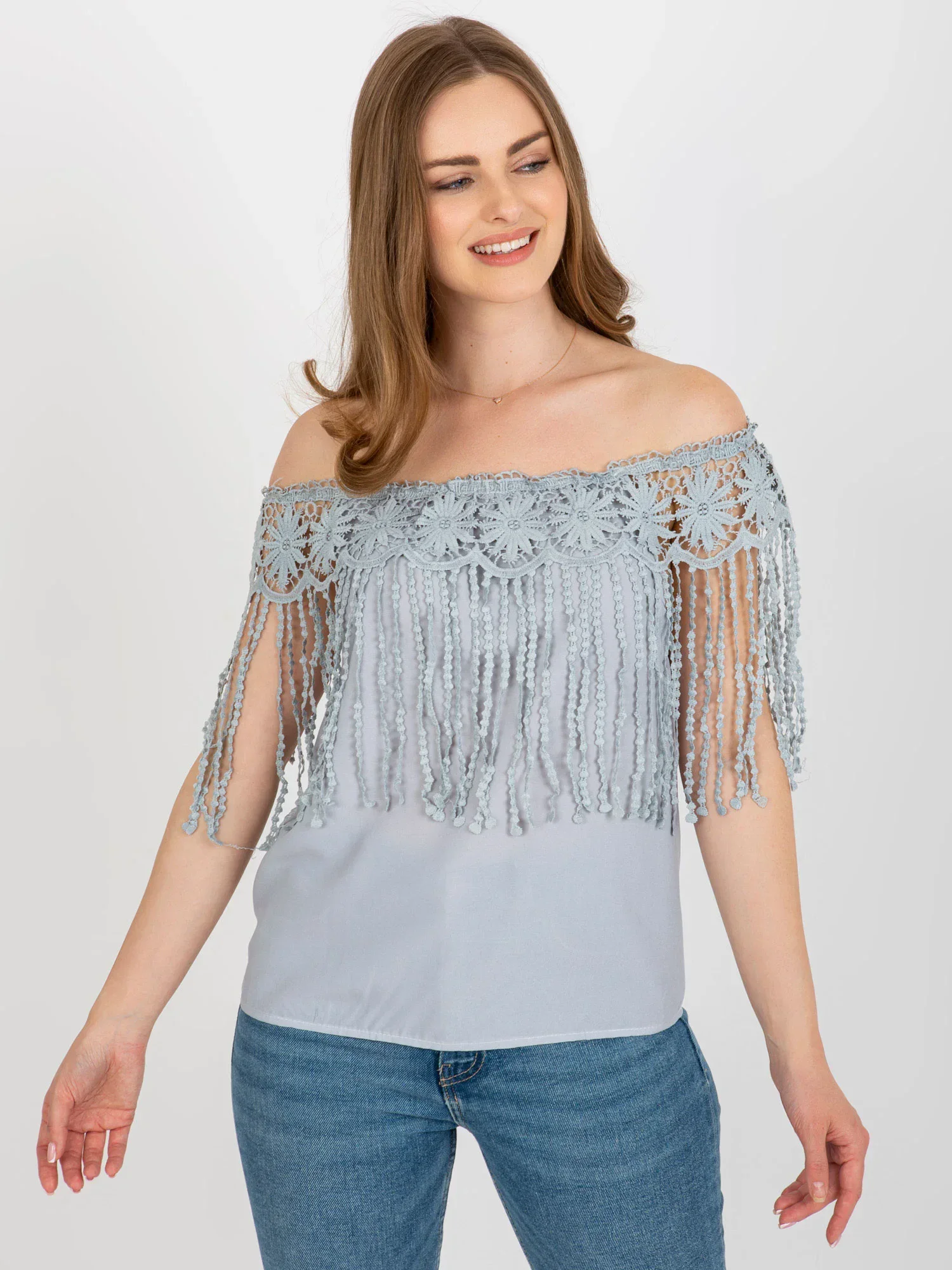 Šedá dámská pruhovaná halenka s třásněmi .