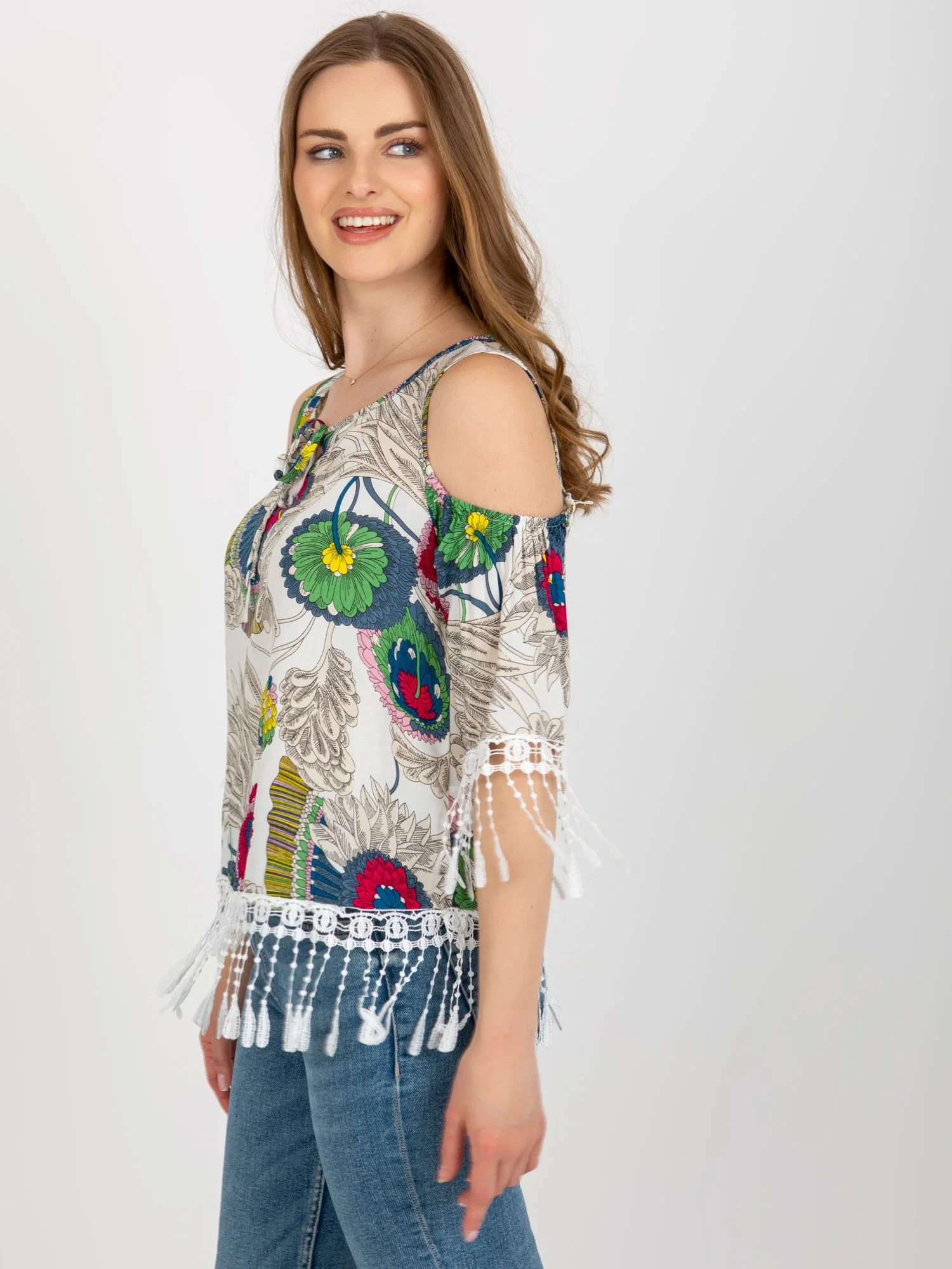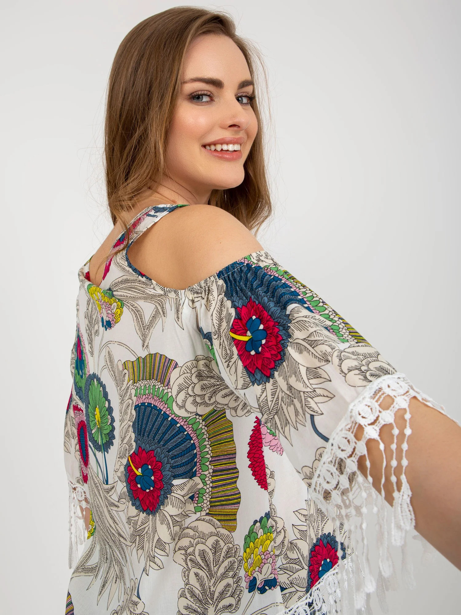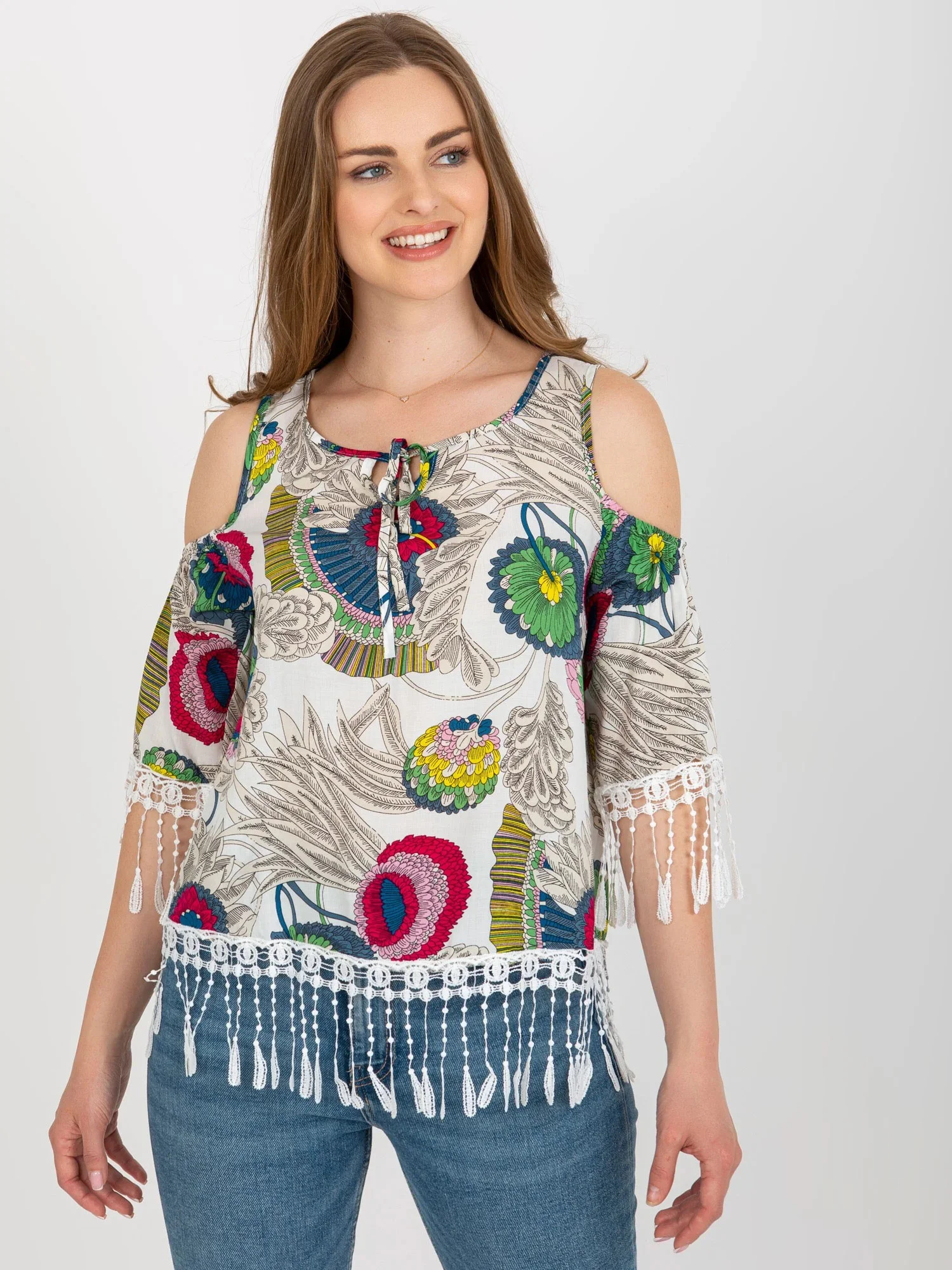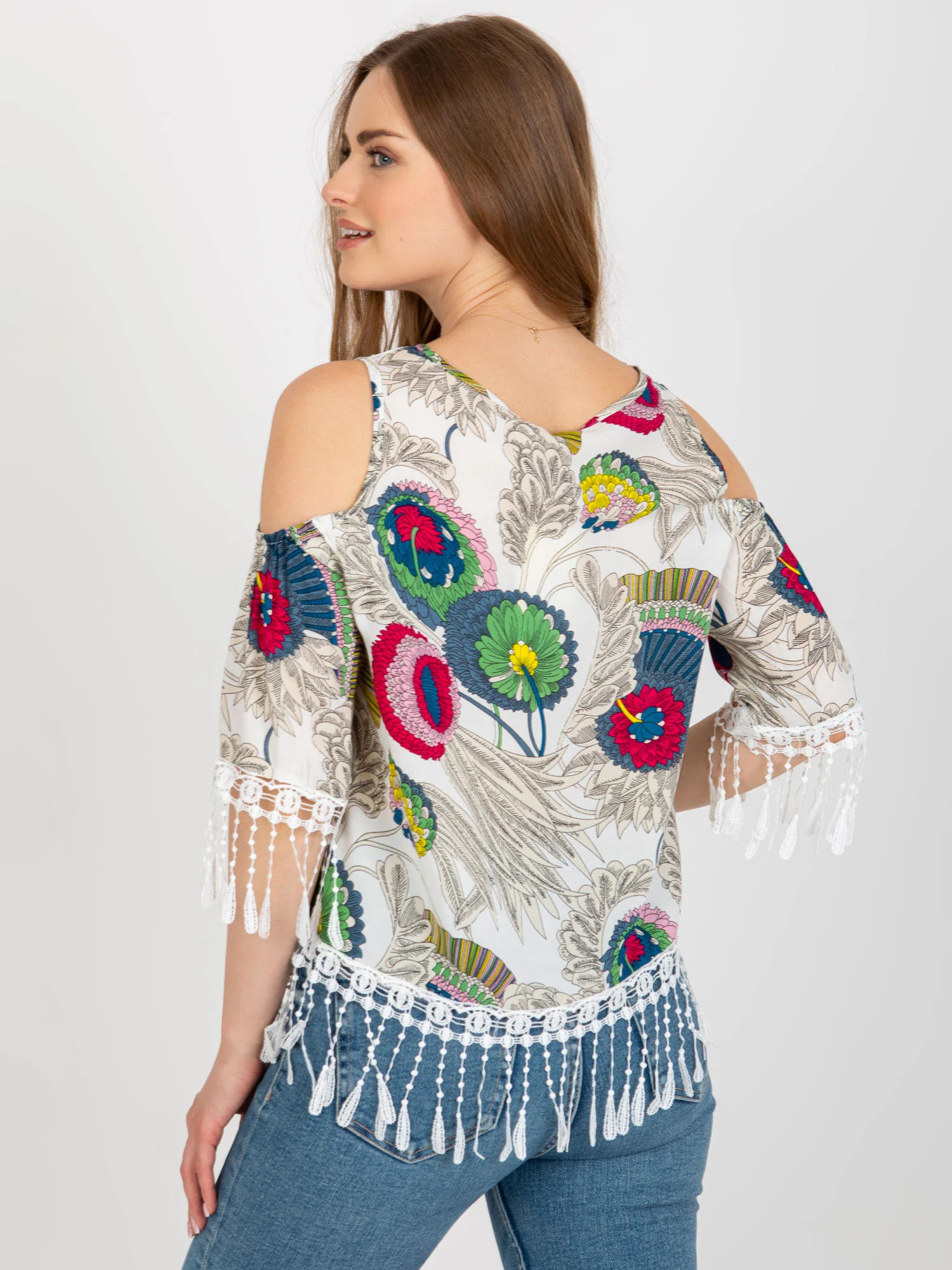 Bílá halenka s potiskem a ozdobným lemováním .