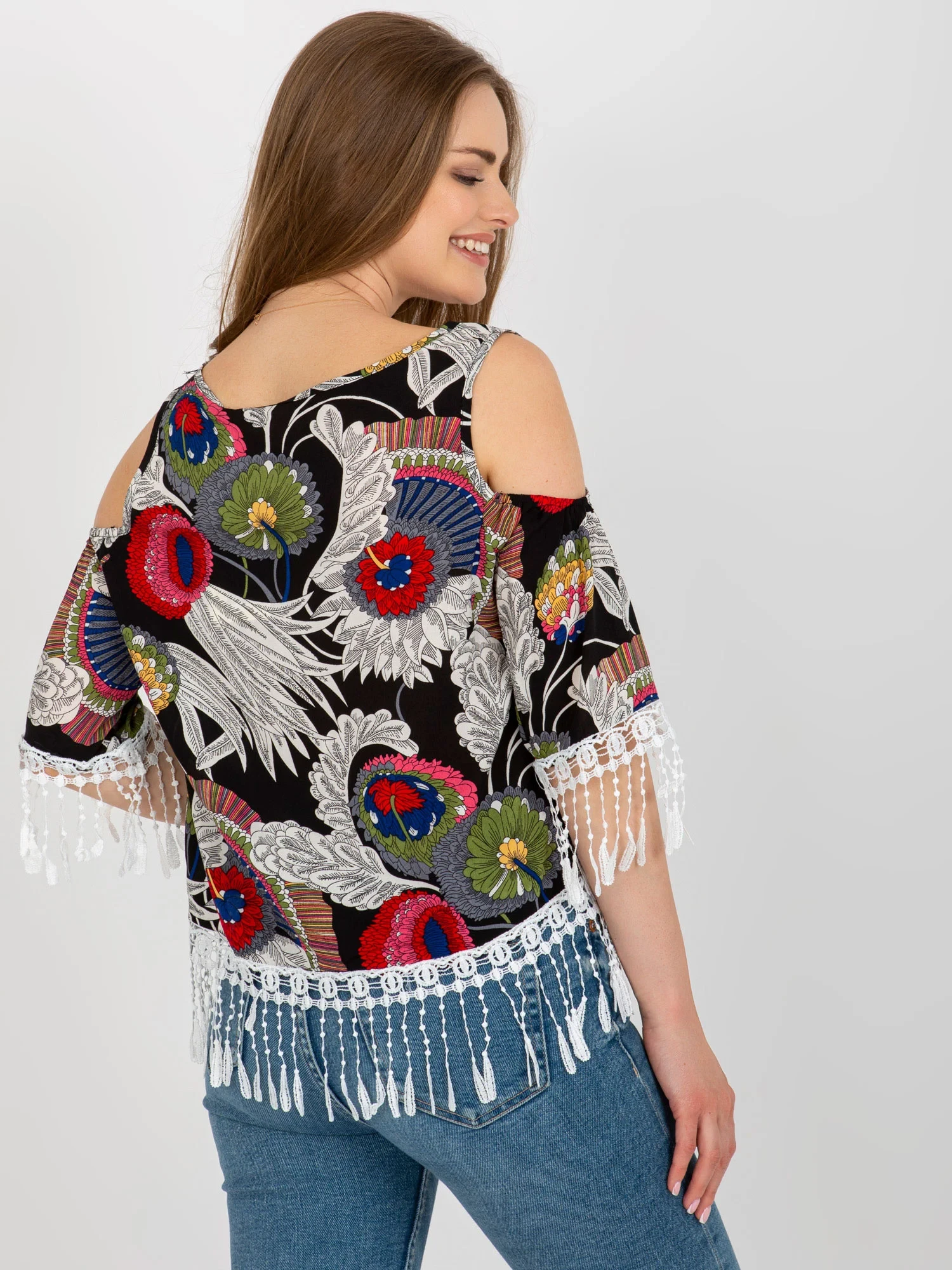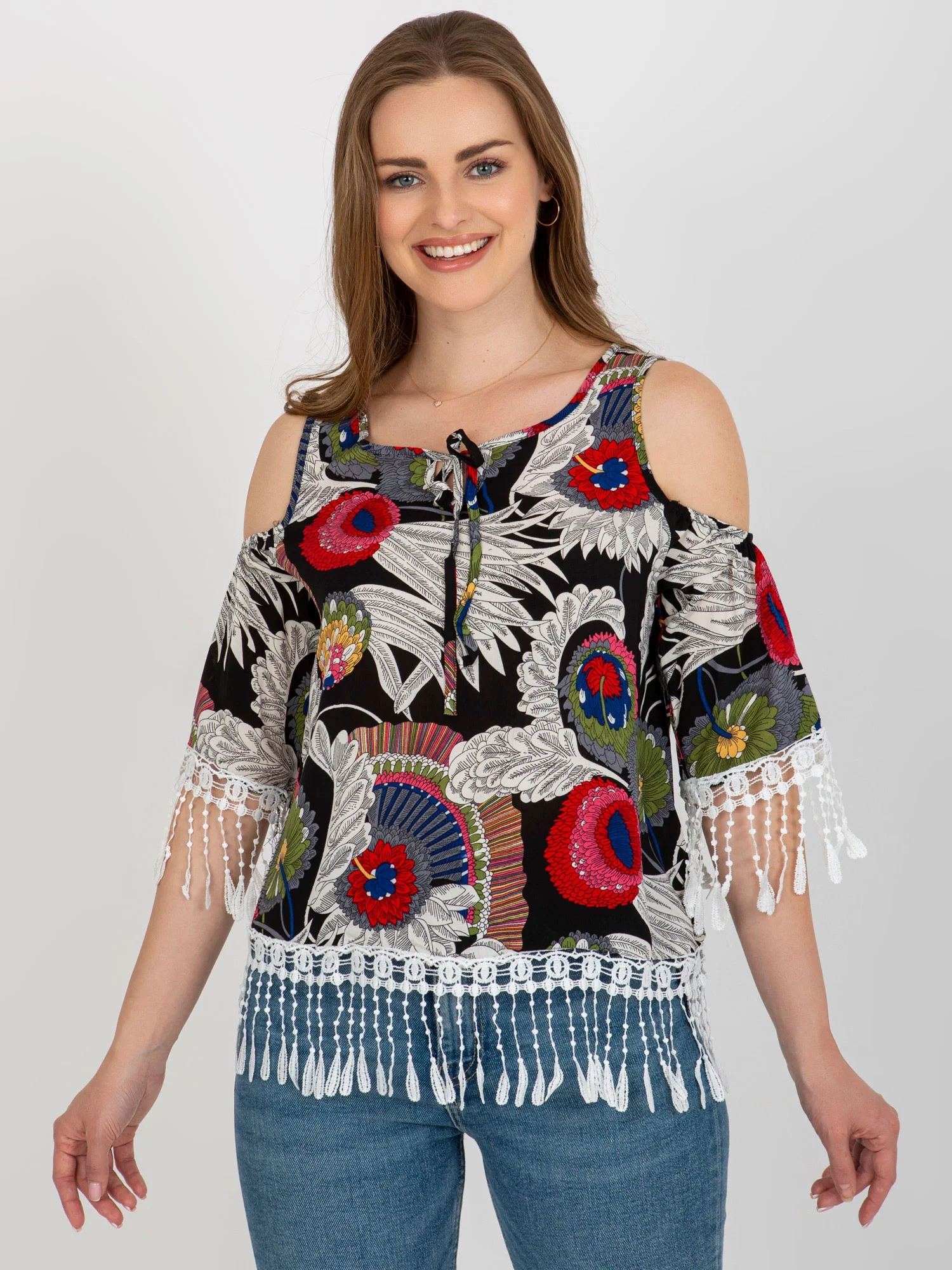 Černá halenka s potiskem a vázáním ve výstřihu .