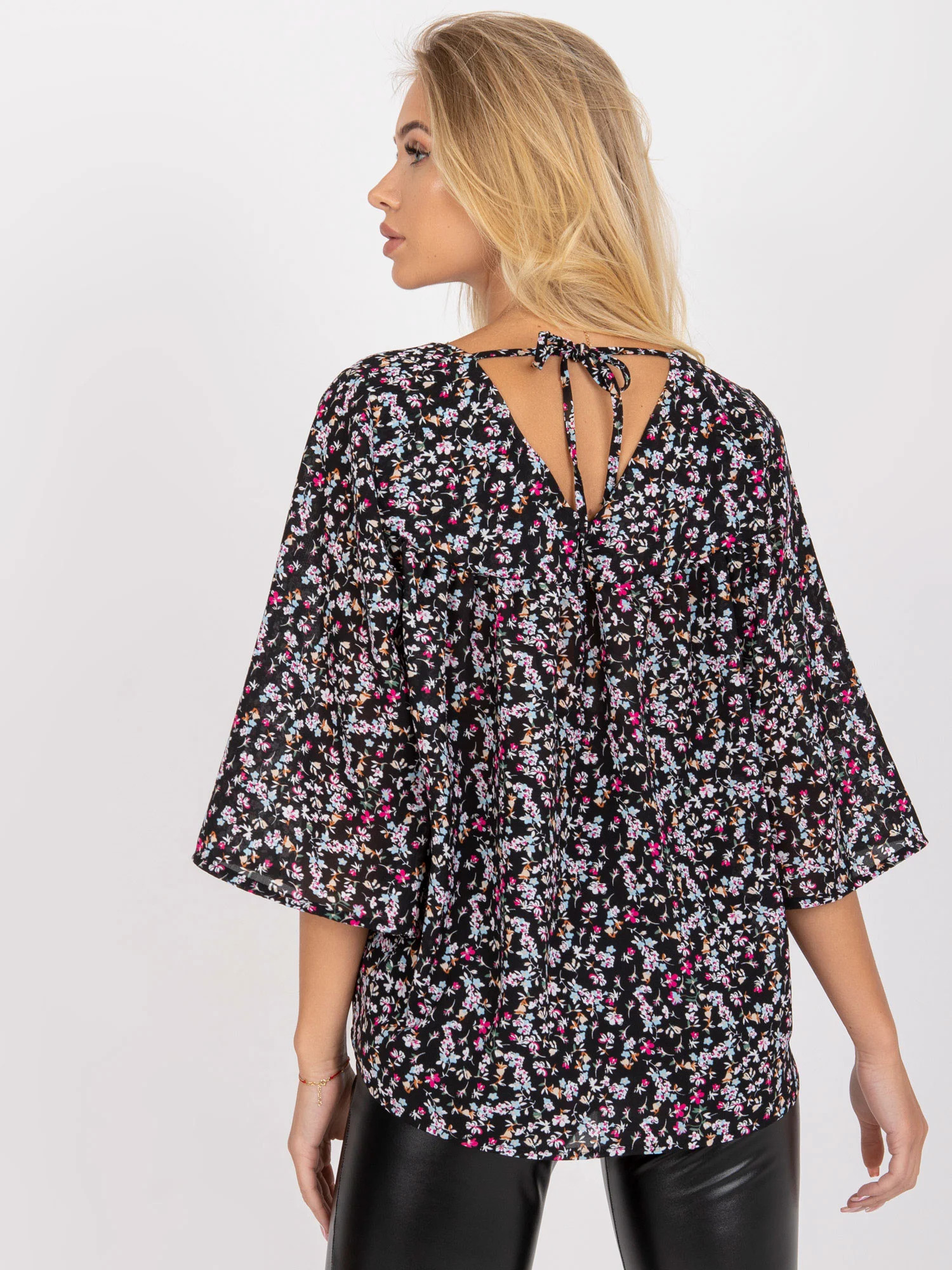 Modelka má na sobě velikost S. Rozměry modelky: výška 175 cm, poprsí 84 cm, pas 62 cm, boky 93 cm.