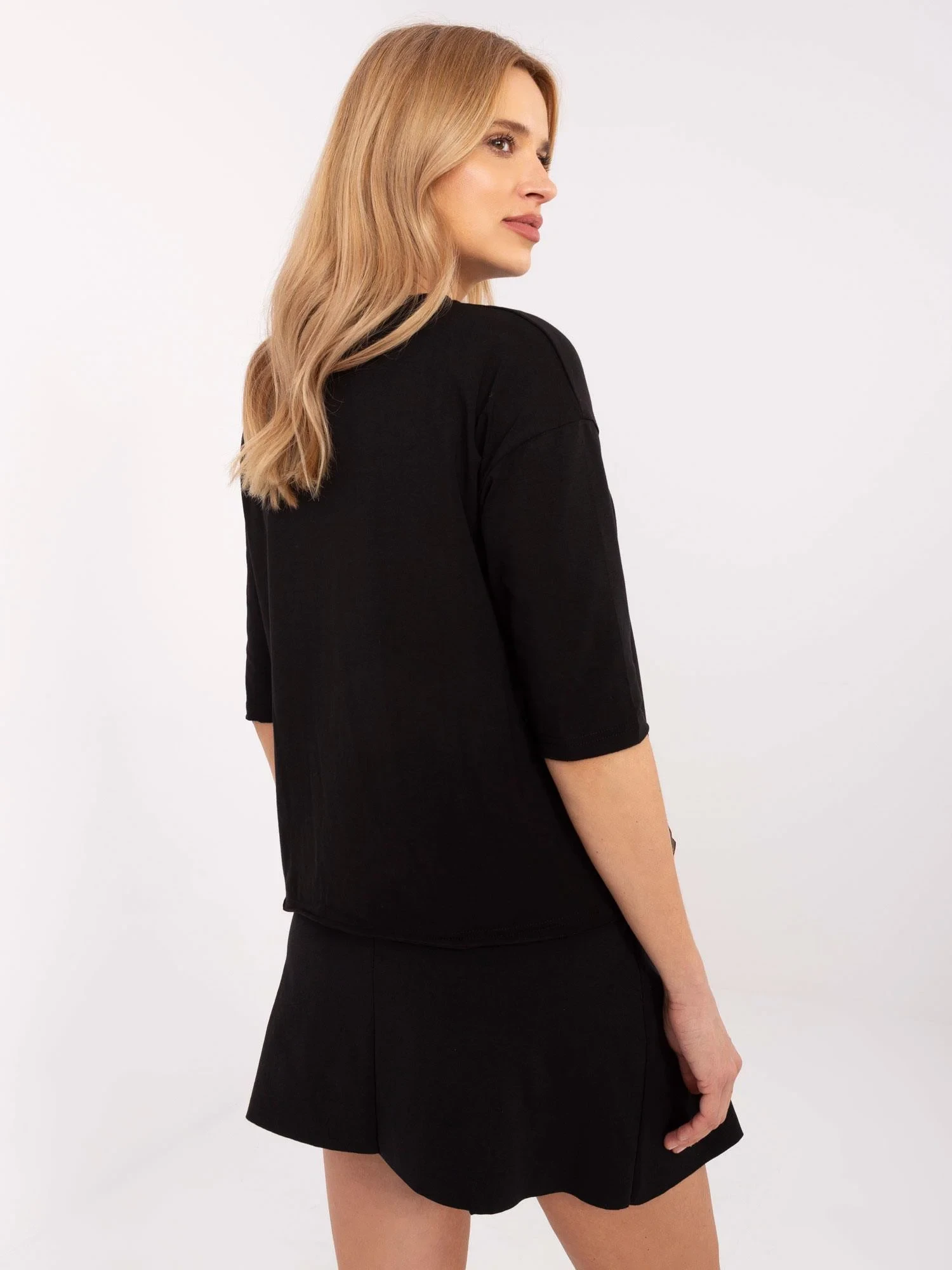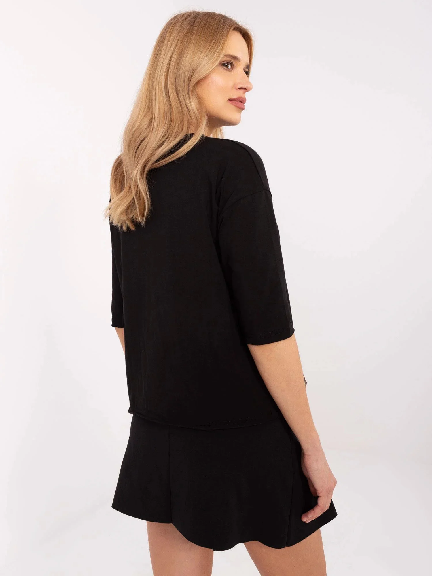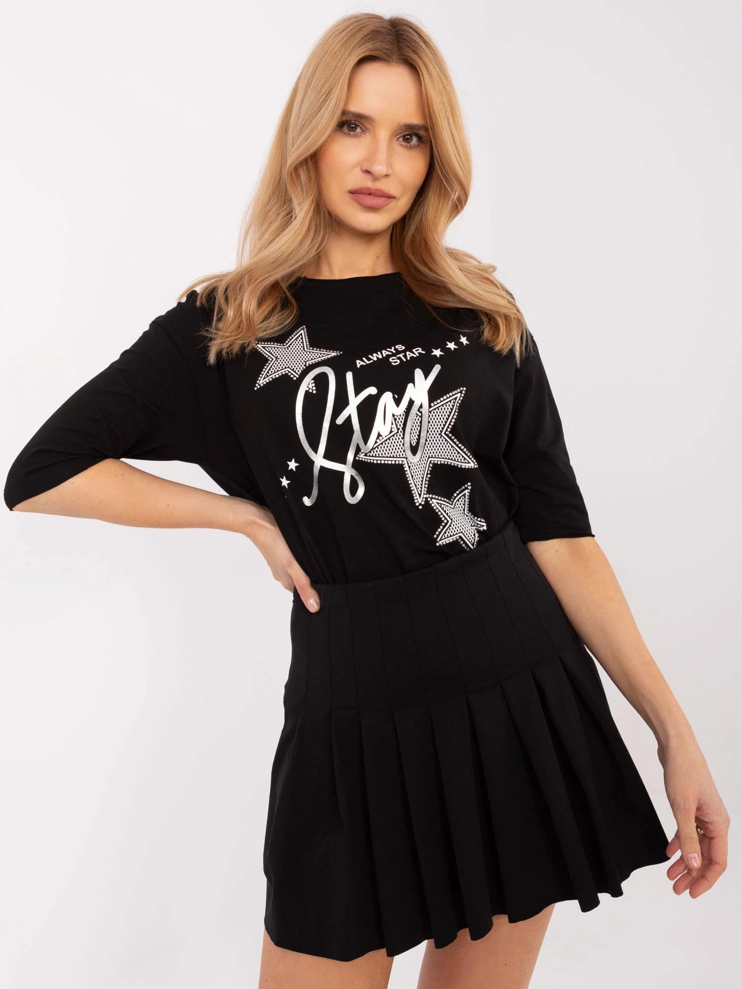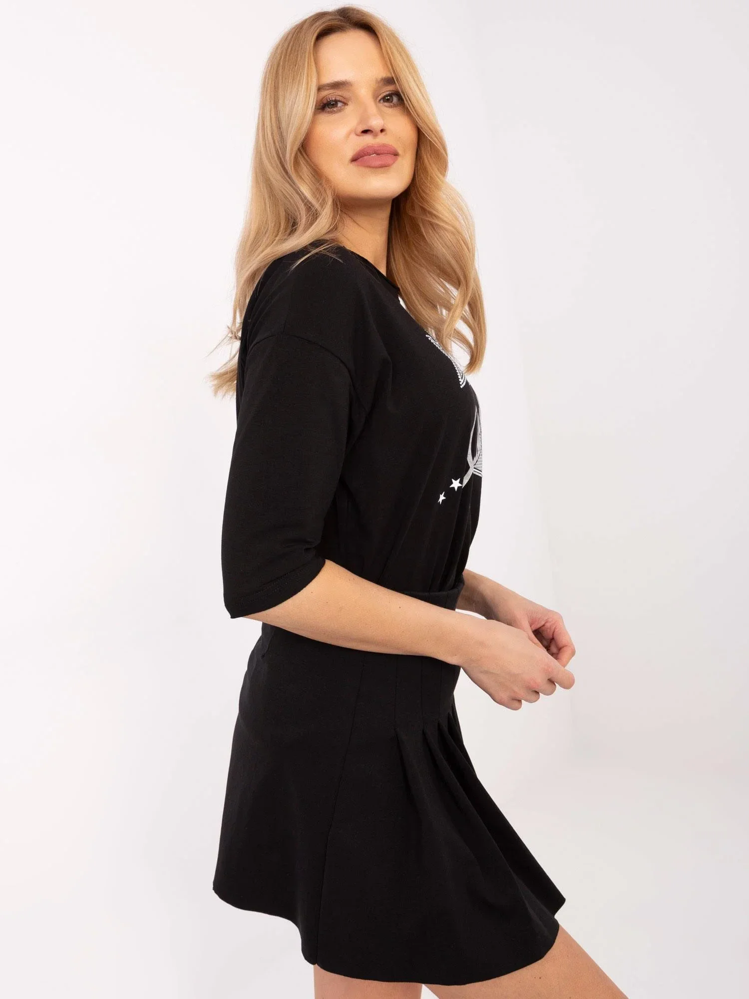Modelka má na sobě velikost S. Rozměry modelky: výška 175 cm, prsa 90 cm, pas 66 cm, boky 94 cm.
