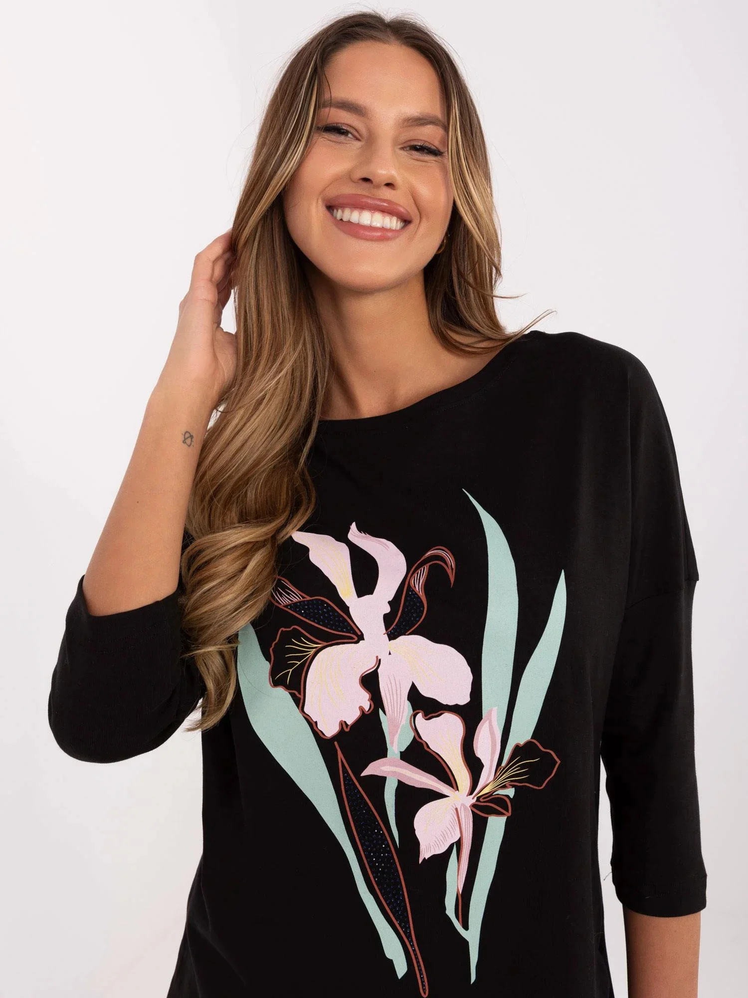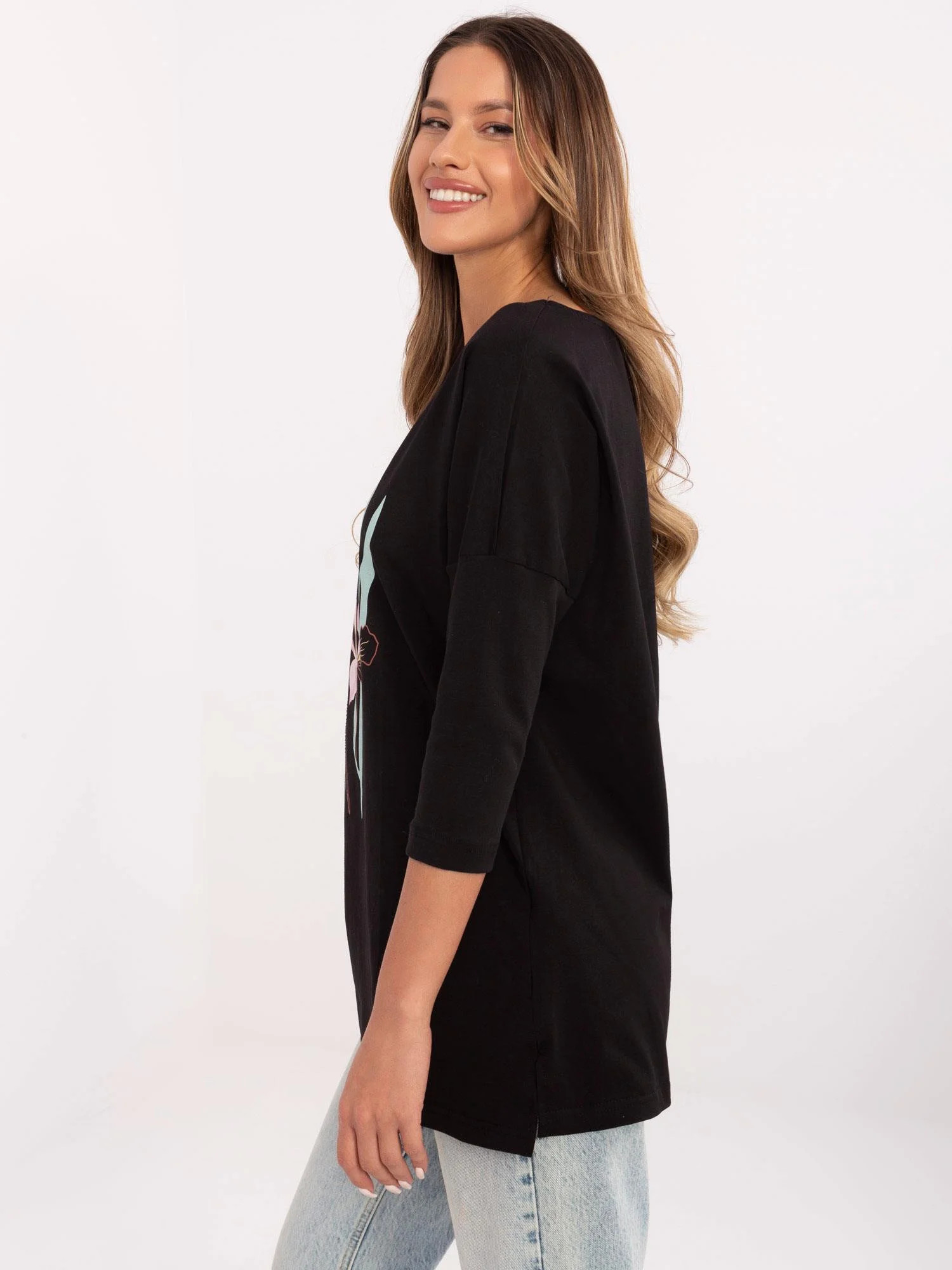 Wymiary bluzki w rozmiarze one size mierzone na płasko: szerokość pod pachami - 58 cm, długość rękawa - 27 cm (od szwu), długość całkowita - 79 cm, szerokość w biodrach - 55 cm (na płasko).