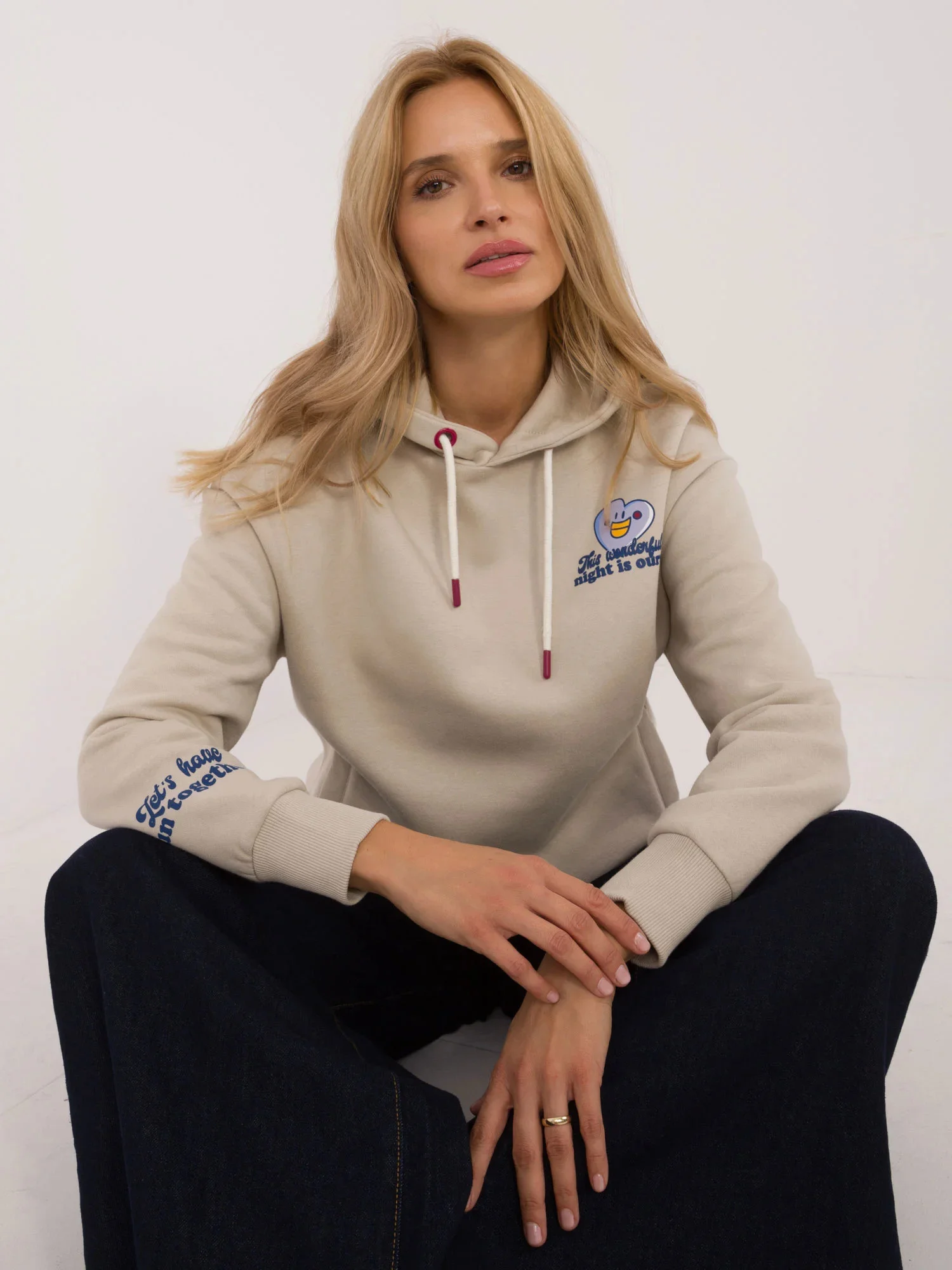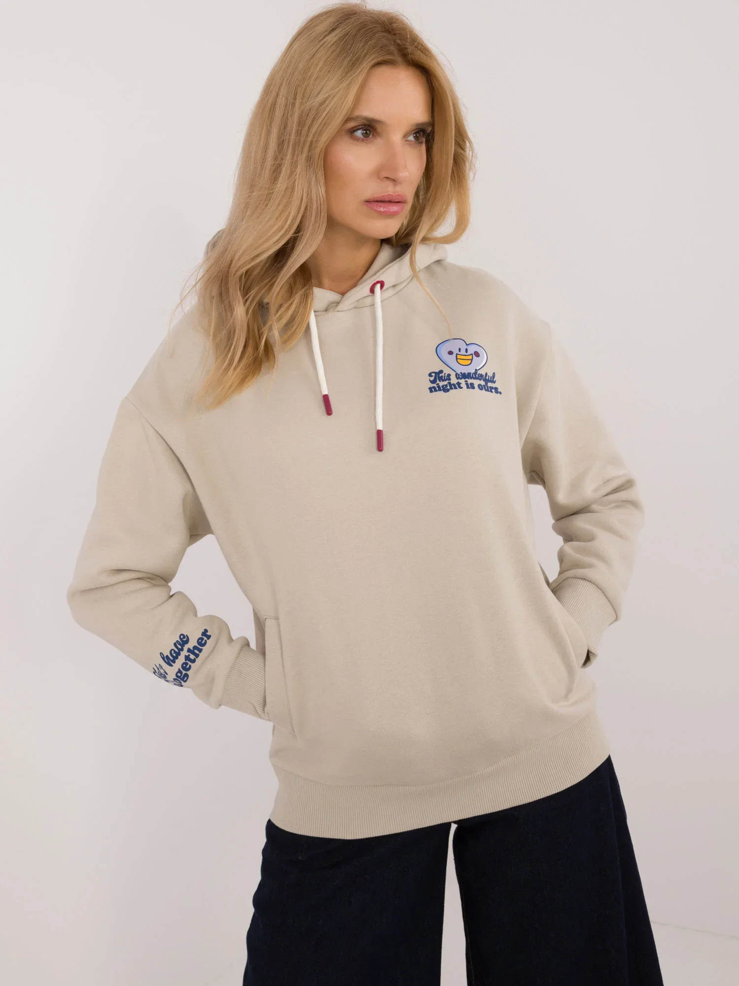 Míry mikiny velikosti S měřené na plocho: šířka v podpaží - 58 cm, délka rukávu - 60 cm, celková délka - 59 cm.