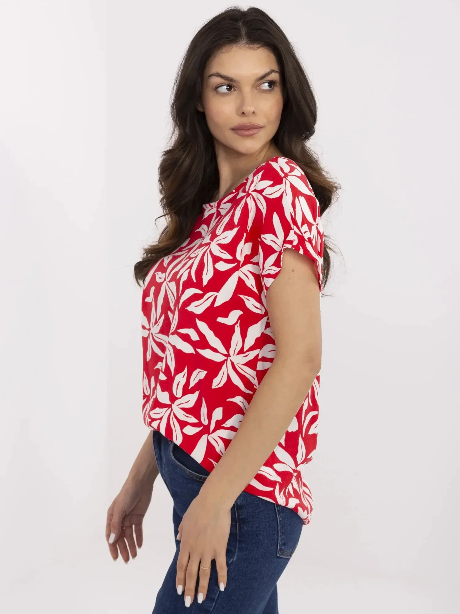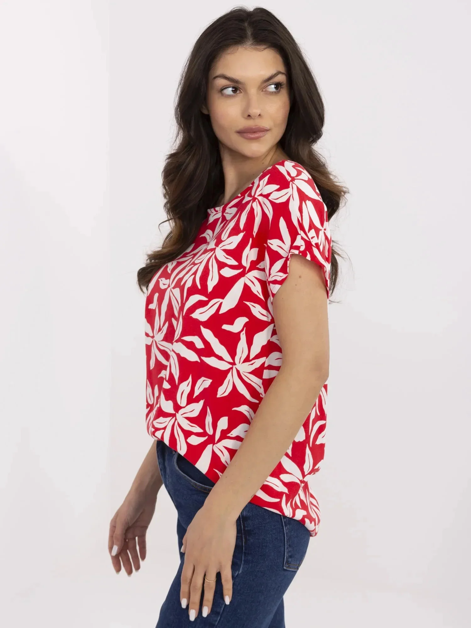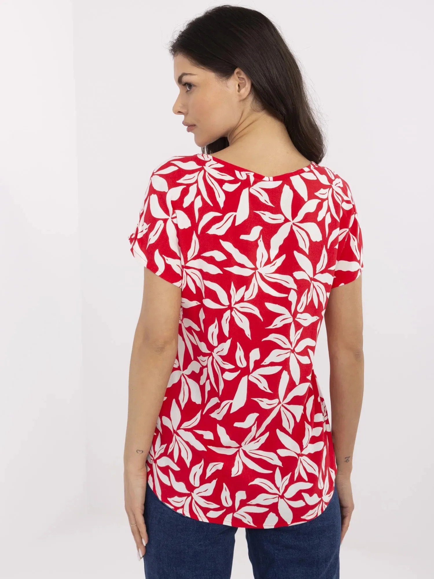 Rozměry halenky velikosti S měřené na plocho: šířka v podpaží - 54 cm délka rukávu - 20 cm (od švu), šířka v bocích - 58 cm, celková délka - 65 cm (vpředu), celková délka - 71 cm (vzadu).