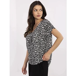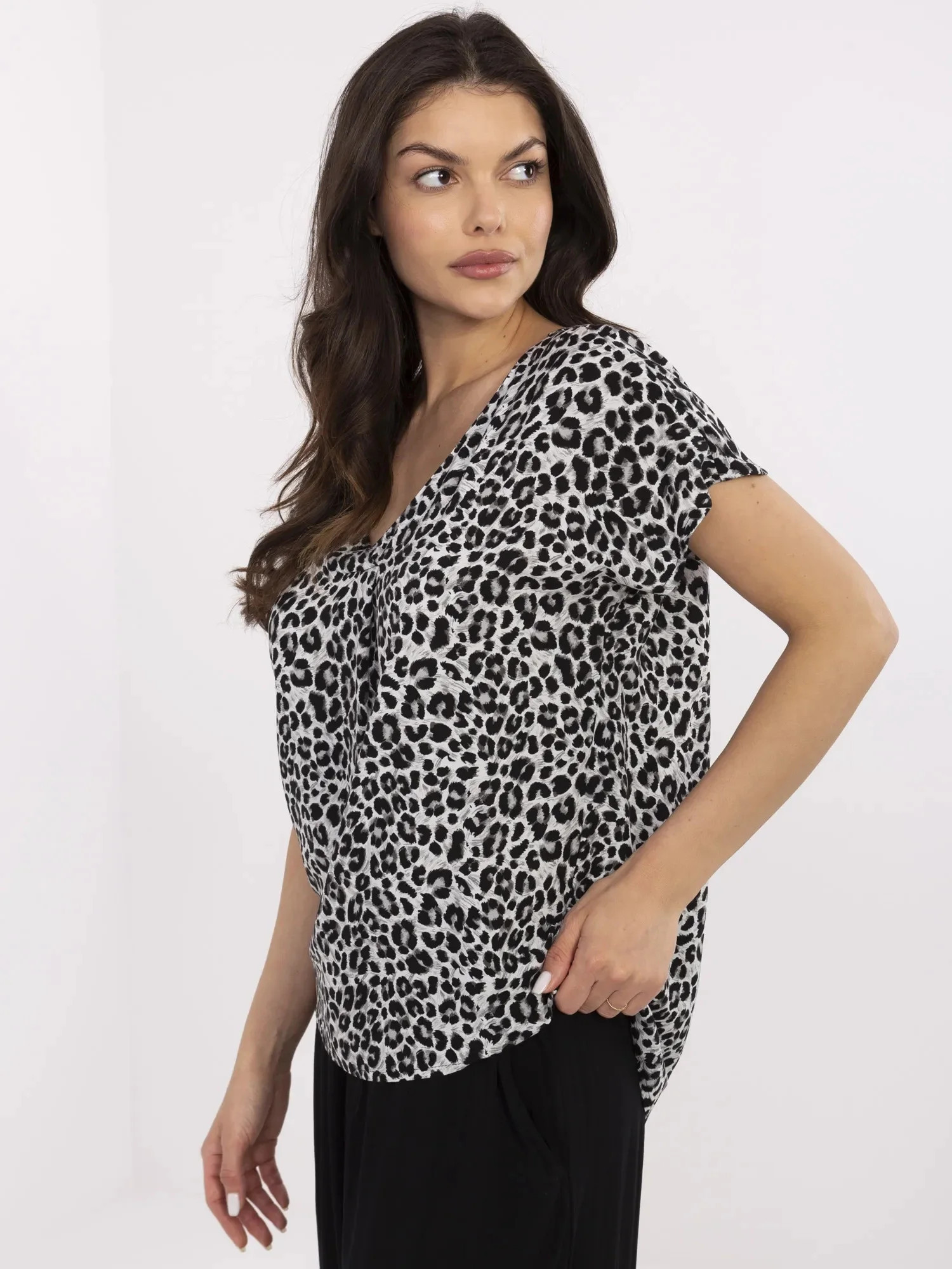 Dámská volná viskózová halenka s krátkým rukávem, výstřih do V, animal potisk.