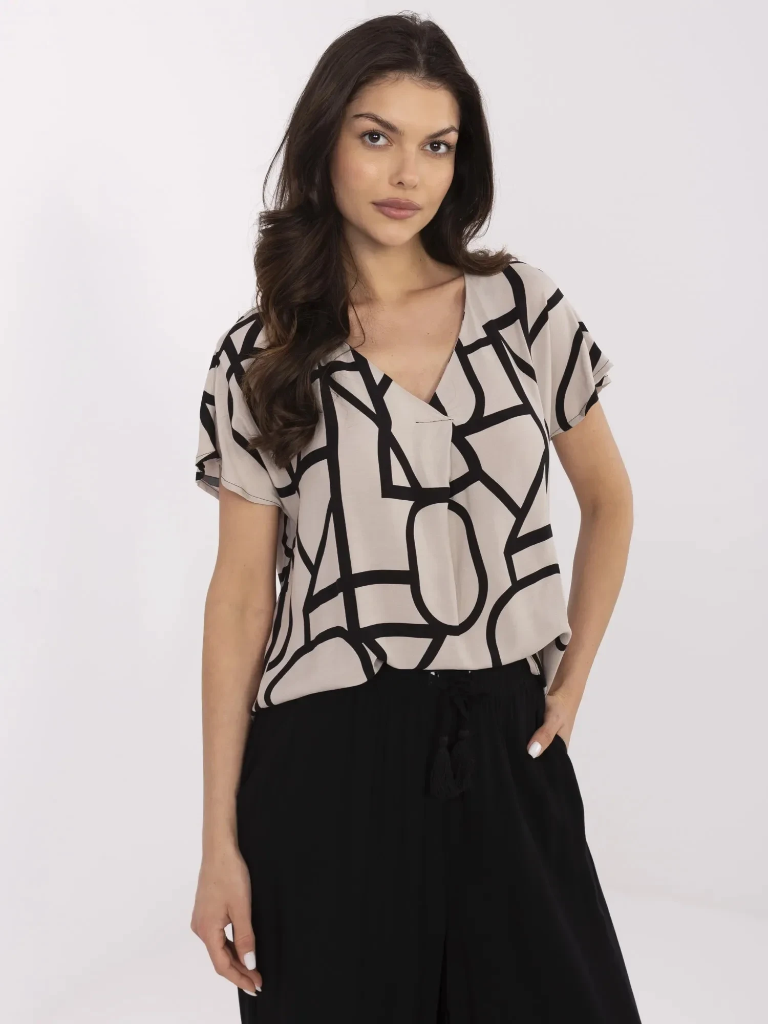 Rozměry halenky velikosti S měřené na plocho: šířka v podpaží - 54 cm, délka rukávu - 23 cm, šířka v bocích - 54 cm, celková délka - 63 cm (vpředu), celková délka - 68 cm (vzadu).