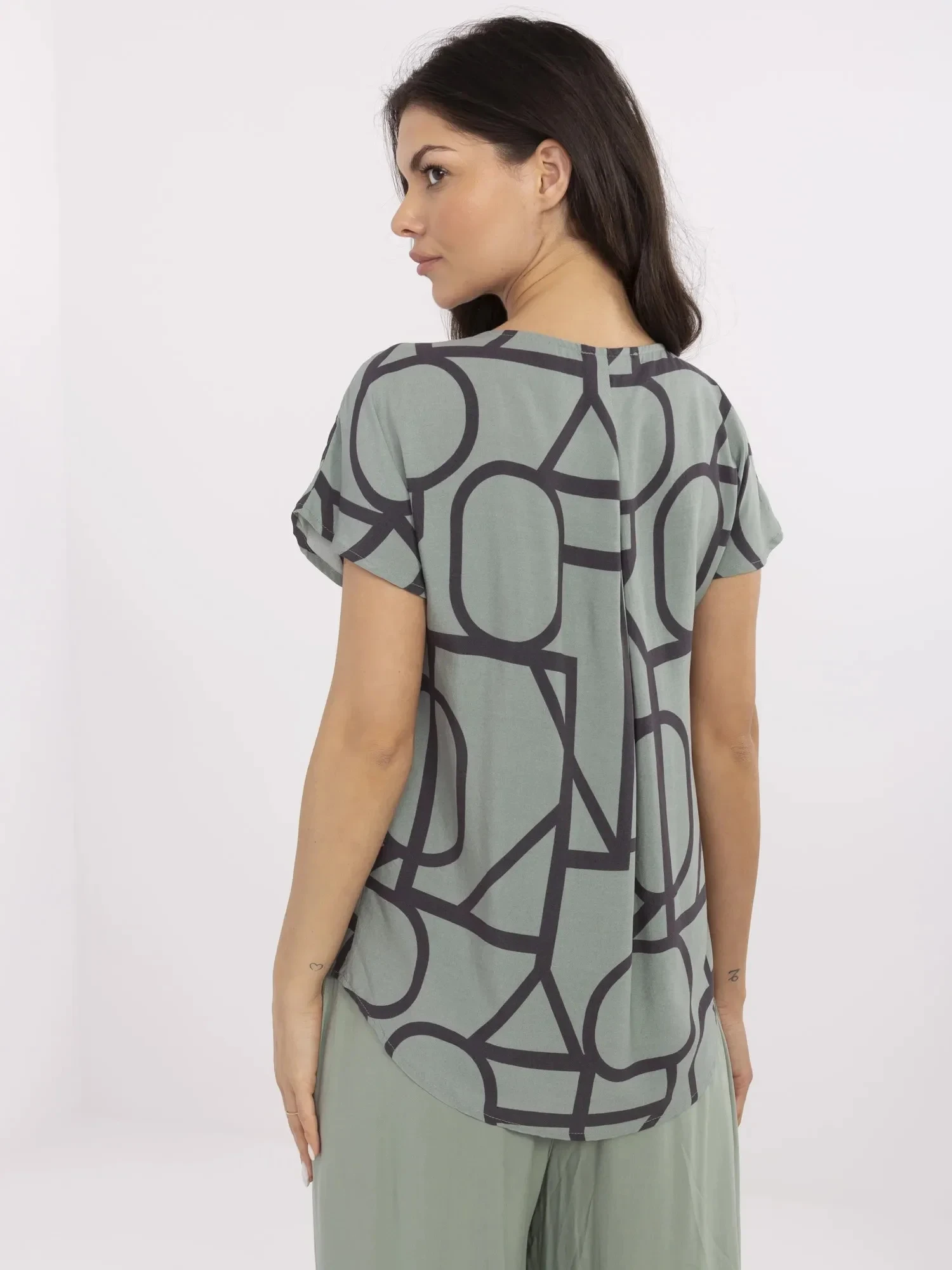 Rozměry halenky velikosti S měřené na plocho: šířka v podpaží - 54 cm, délka rukávu - 23 cm, šířka v bocích - 54 cm, celková délka - 63 cm (vpředu), celková délka - 68 cm (vzadu).