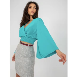 Modrá společenská halenka s obálkovým výstřihem .