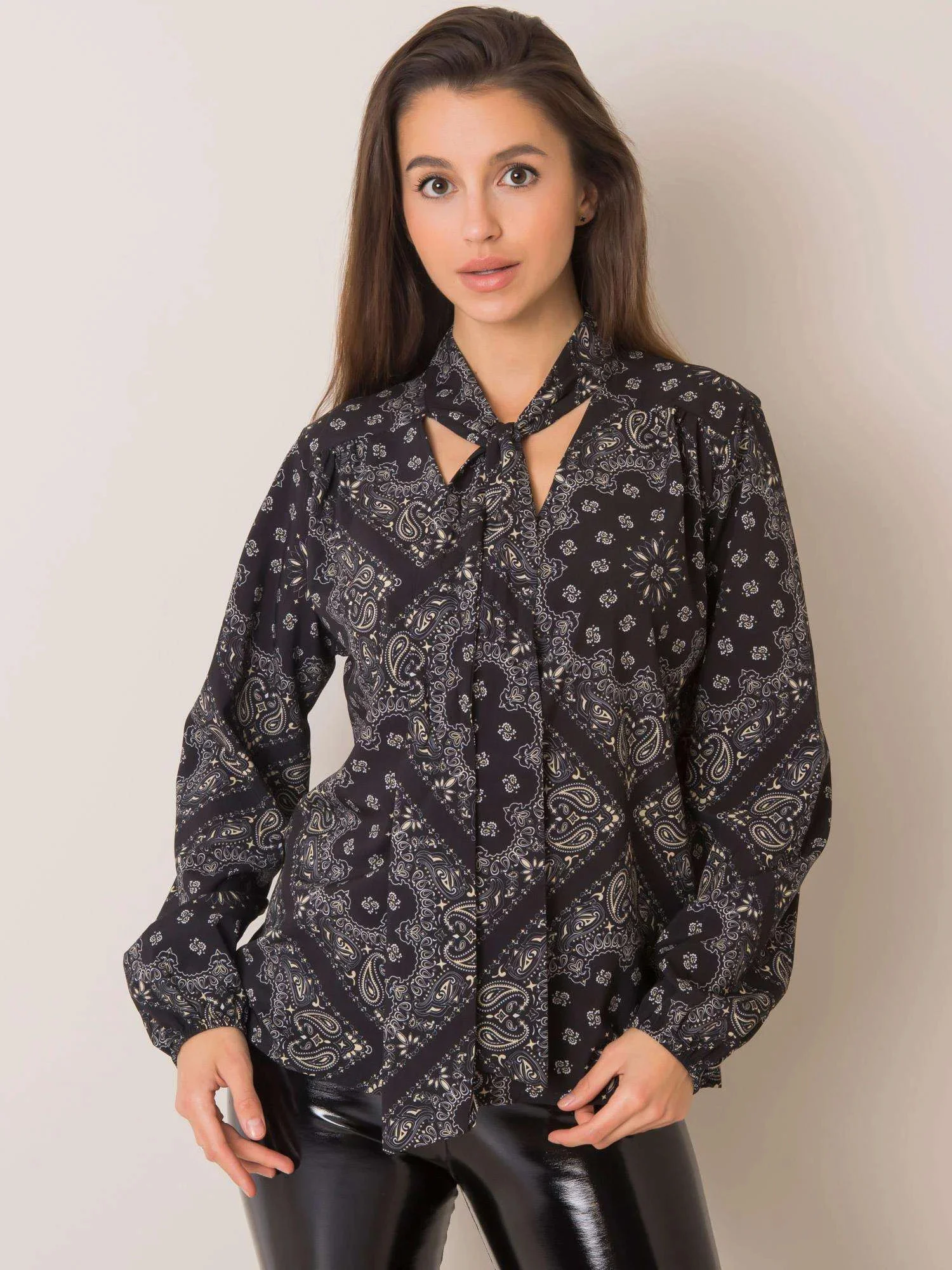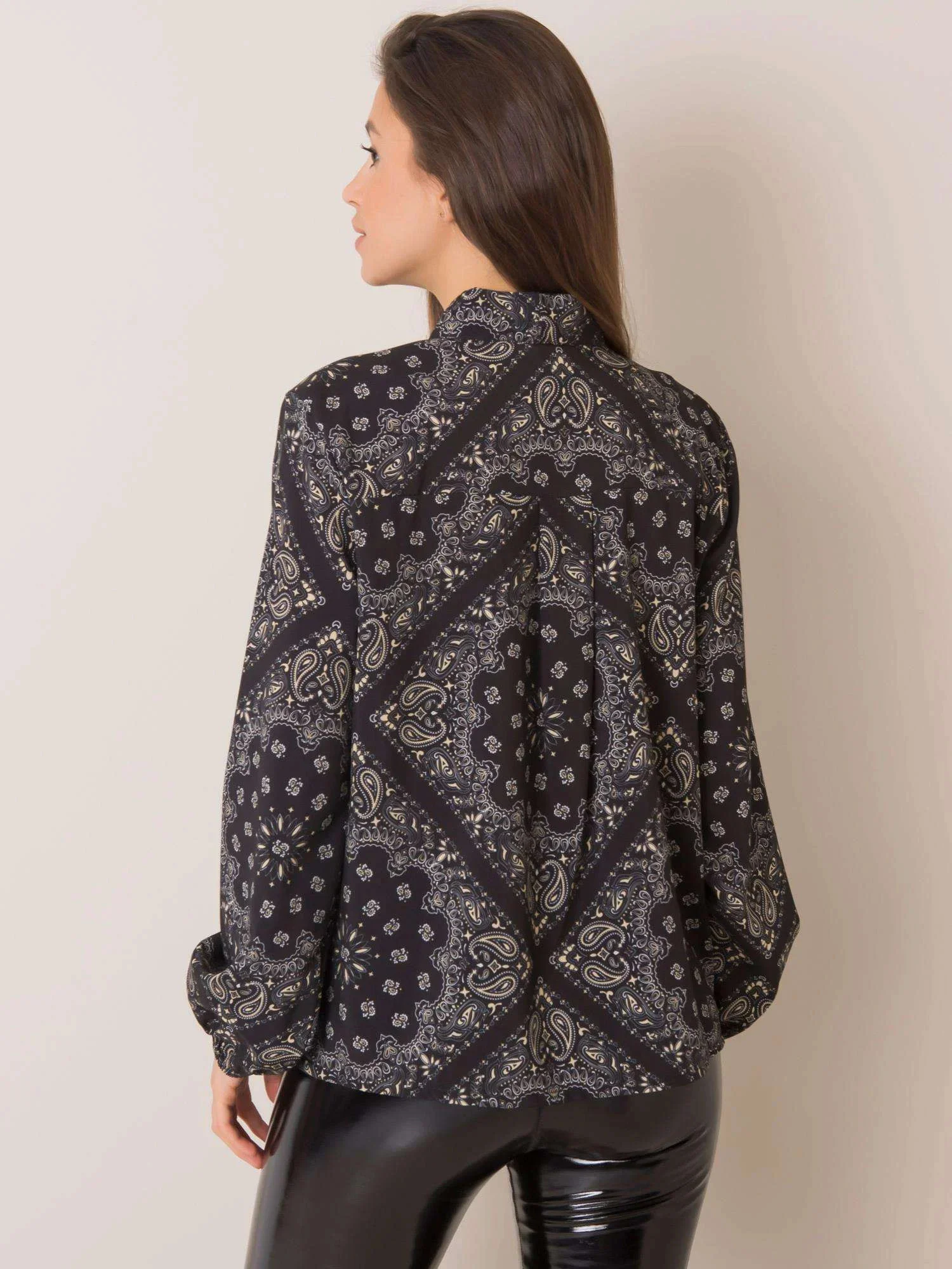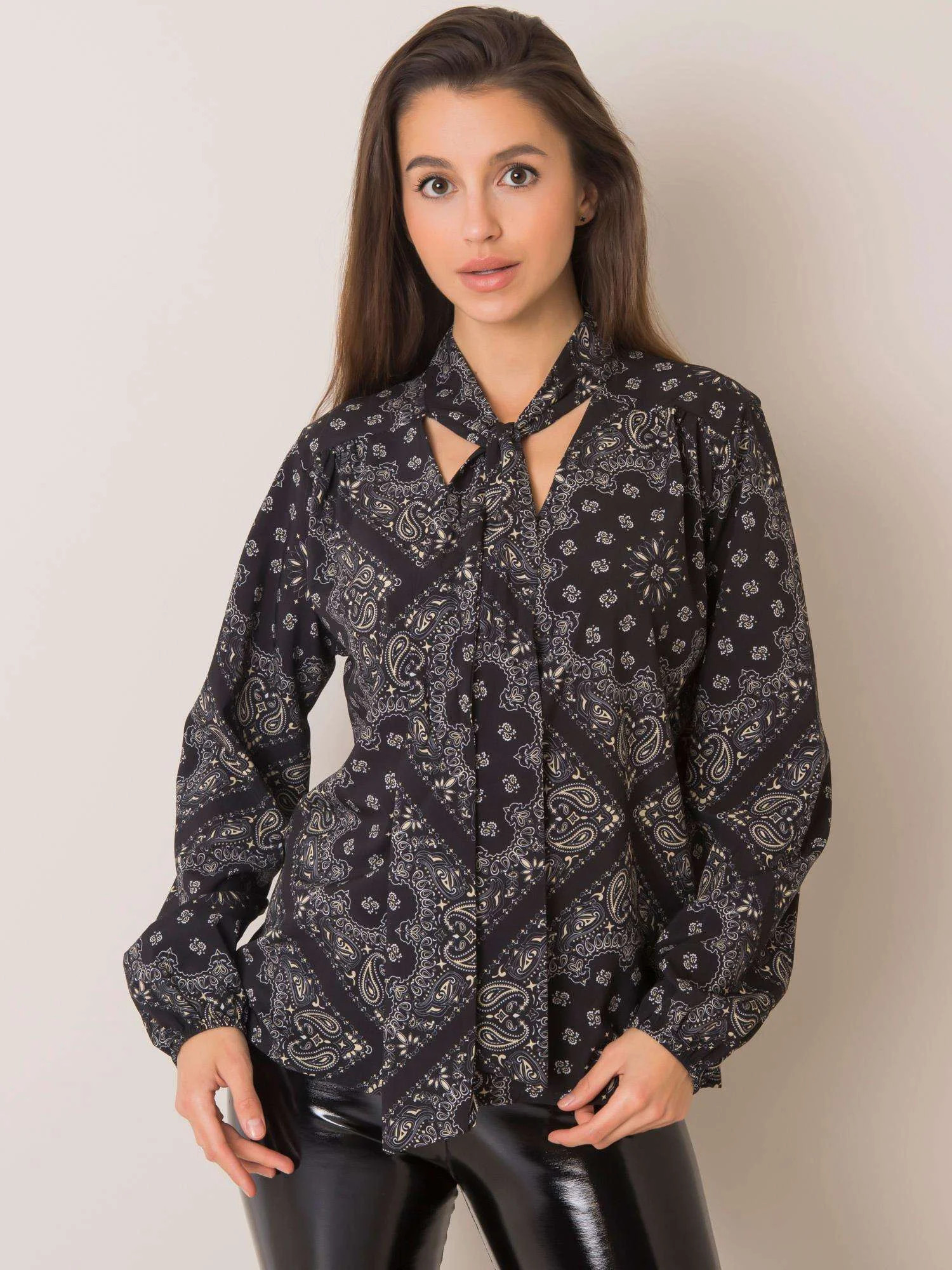 Černá vzorovaná halenka s vázáním .