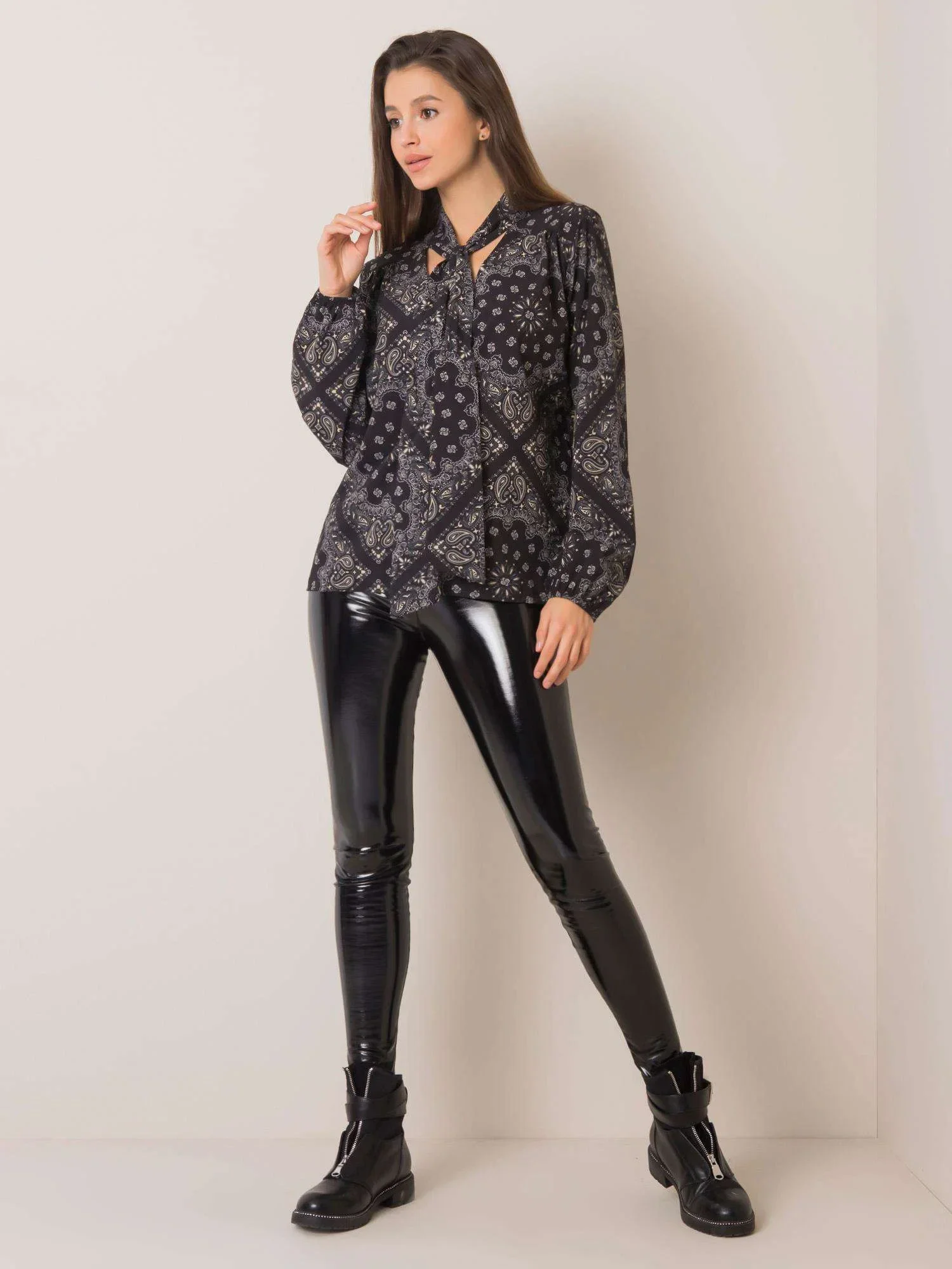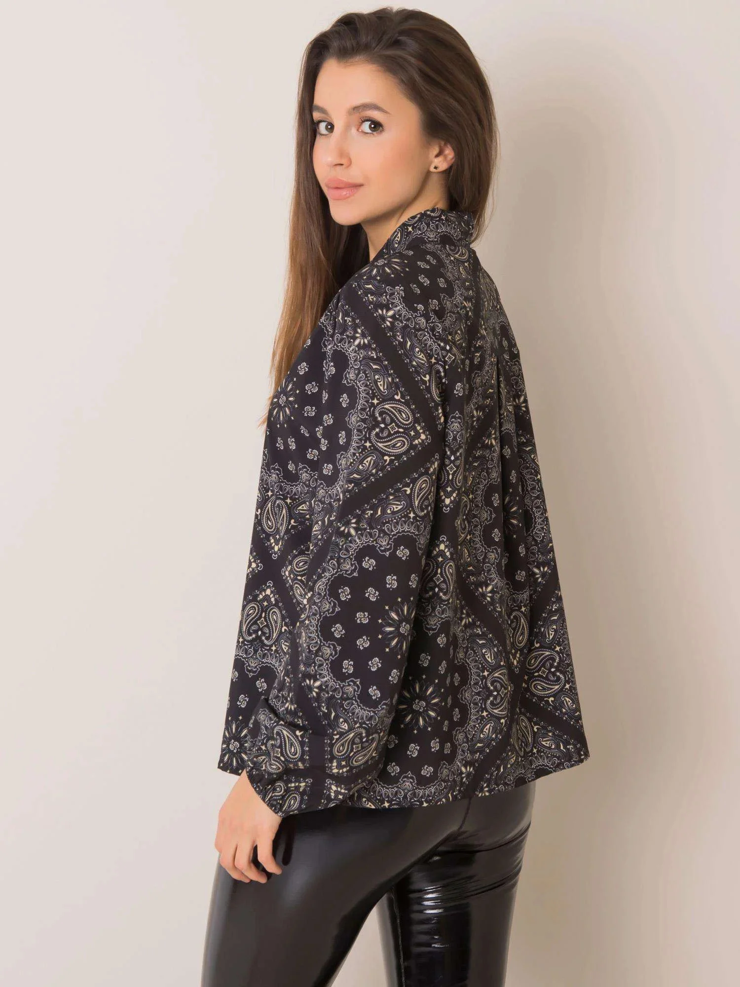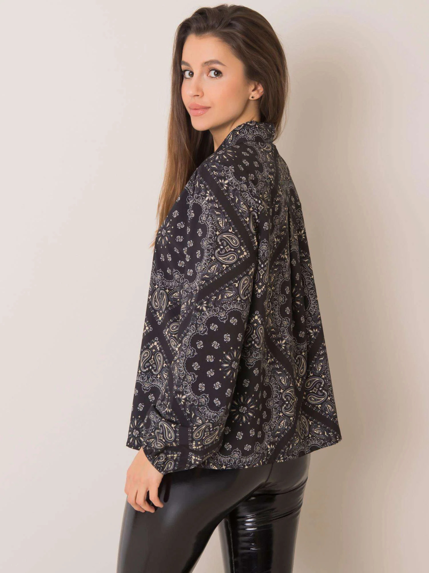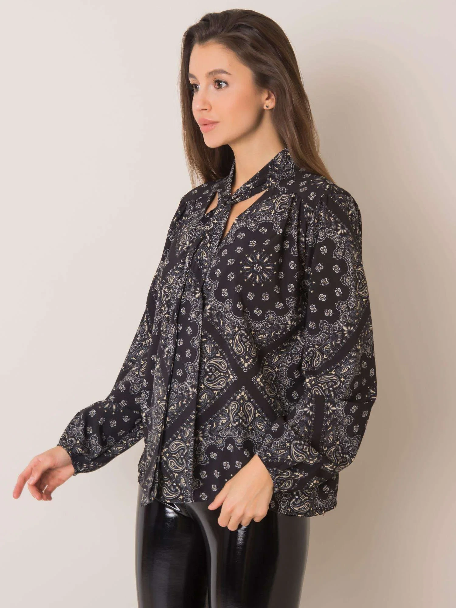 Černá vzorovaná halenka s vázáním .
