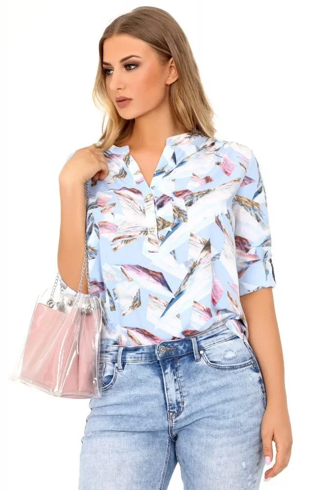 Výrazná halenka, která nabízí mnoho možností designu. Modrá, zdobená geometrickým potiskem v odstínech bílé a růžové. Rukávy ve 3/4 délce s možností ohrnutí do manžety. Mírně prodloužená a zakulacená záda. Jemný výstřih se stojáčkem a ozdobnými lesklými knoflíky. Složení: 95% polyester, 5% spandex.