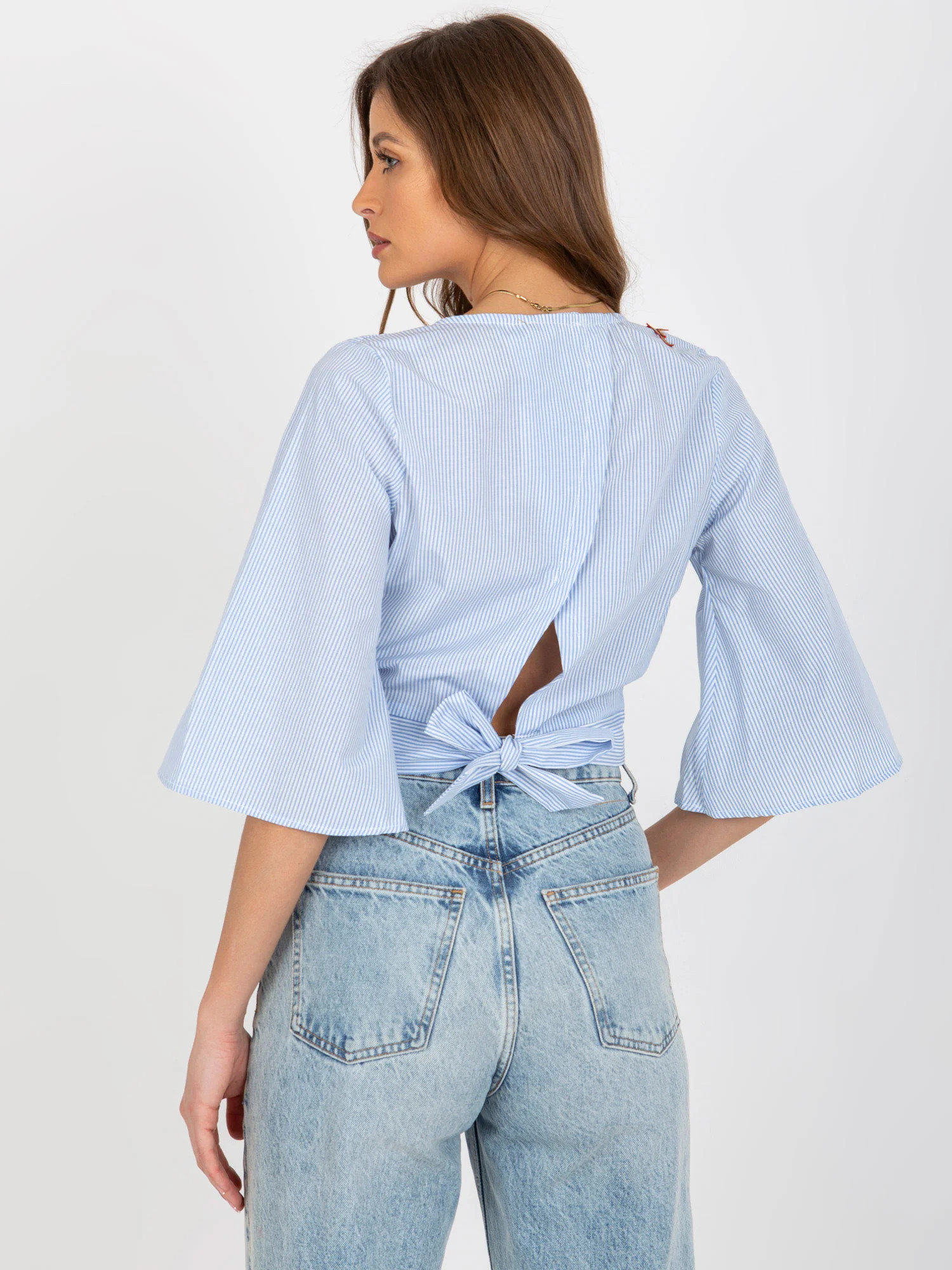 Světle modrá a bílá pruhovaná krátká společenská halenka .