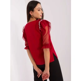 Bordó společenská halenka se síťovanými rukávy .