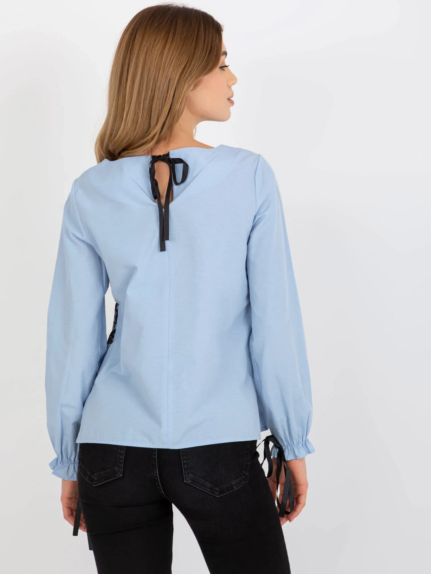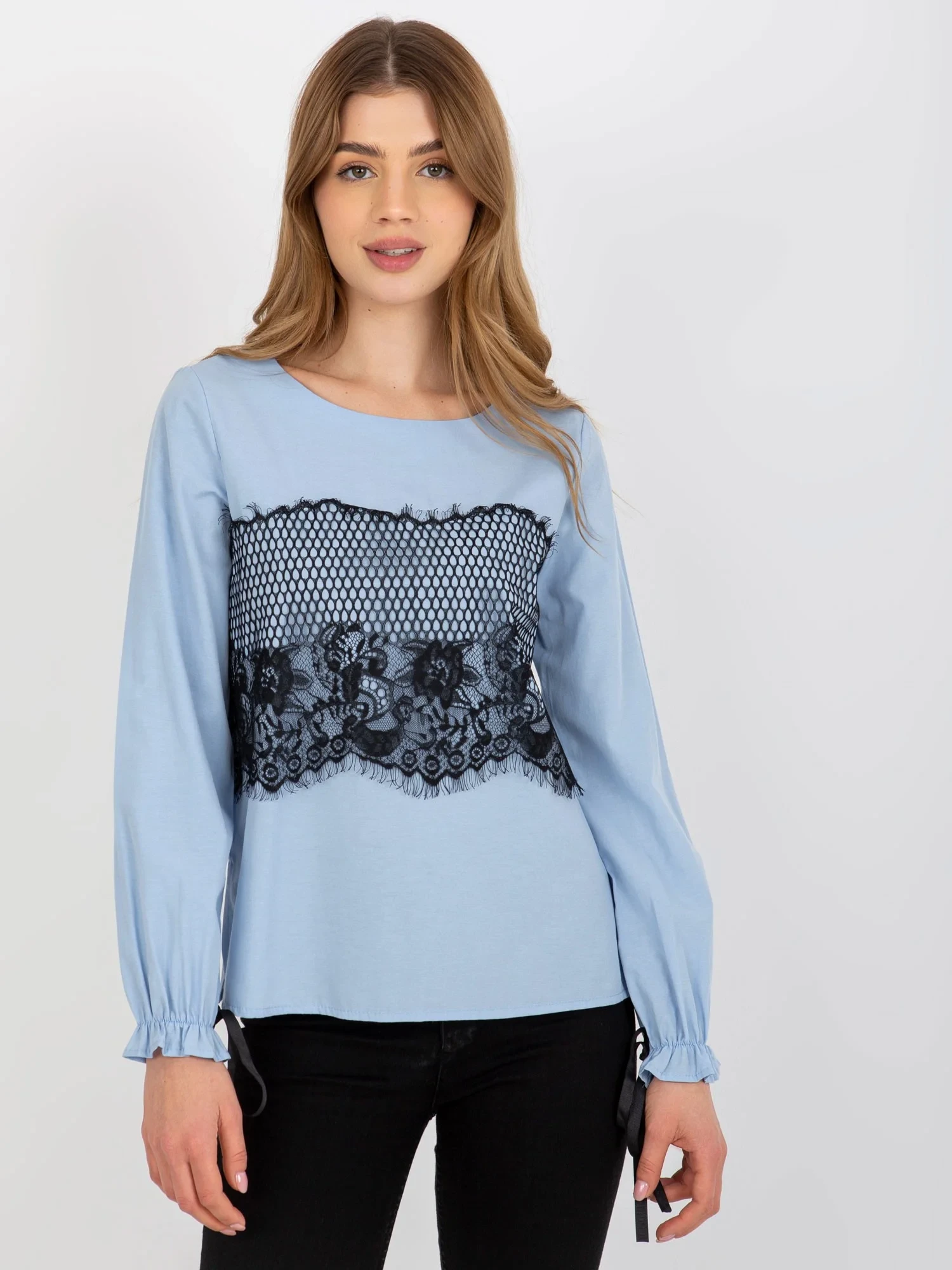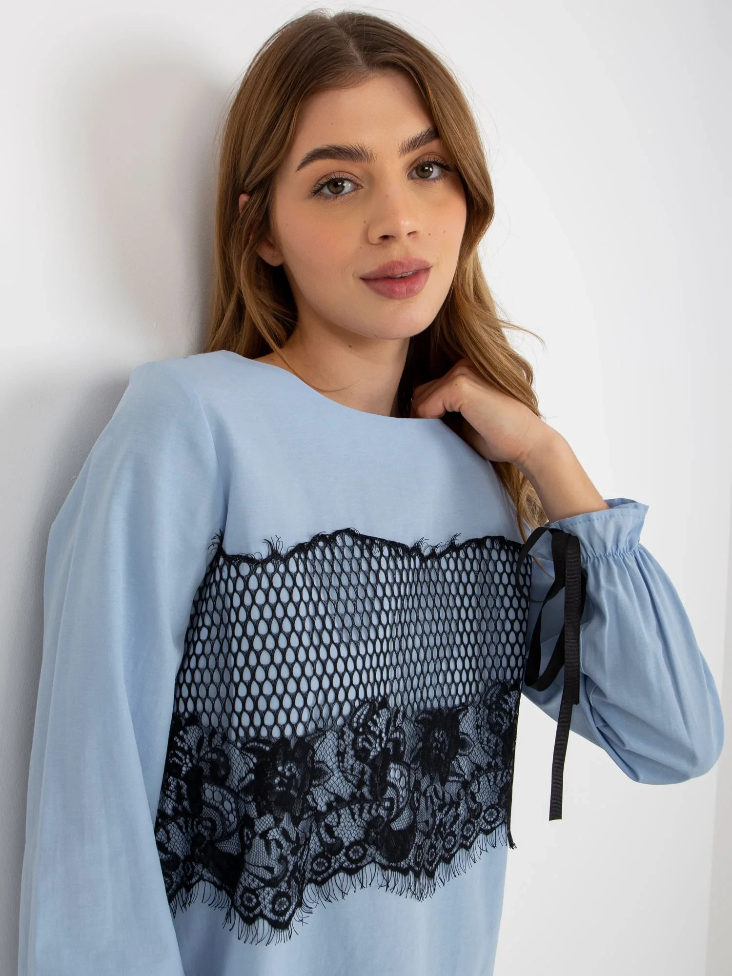 Světle modrá bavlněná společenská halenka s krajkou .