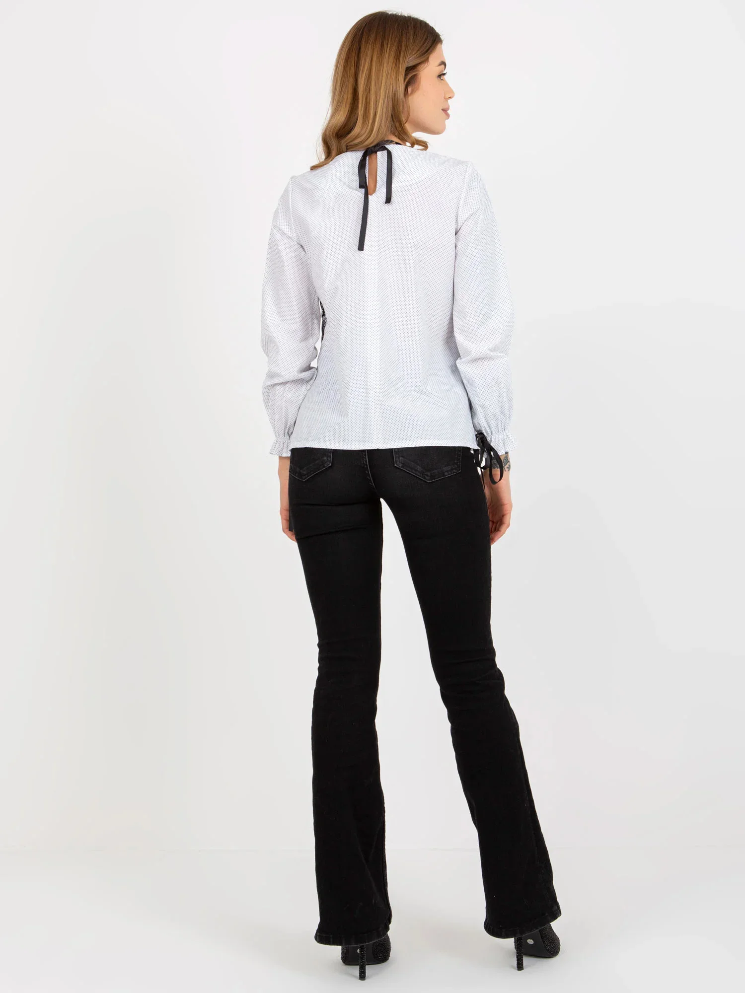 Černobílá puntíkovaná společenská halenka s kravatou .