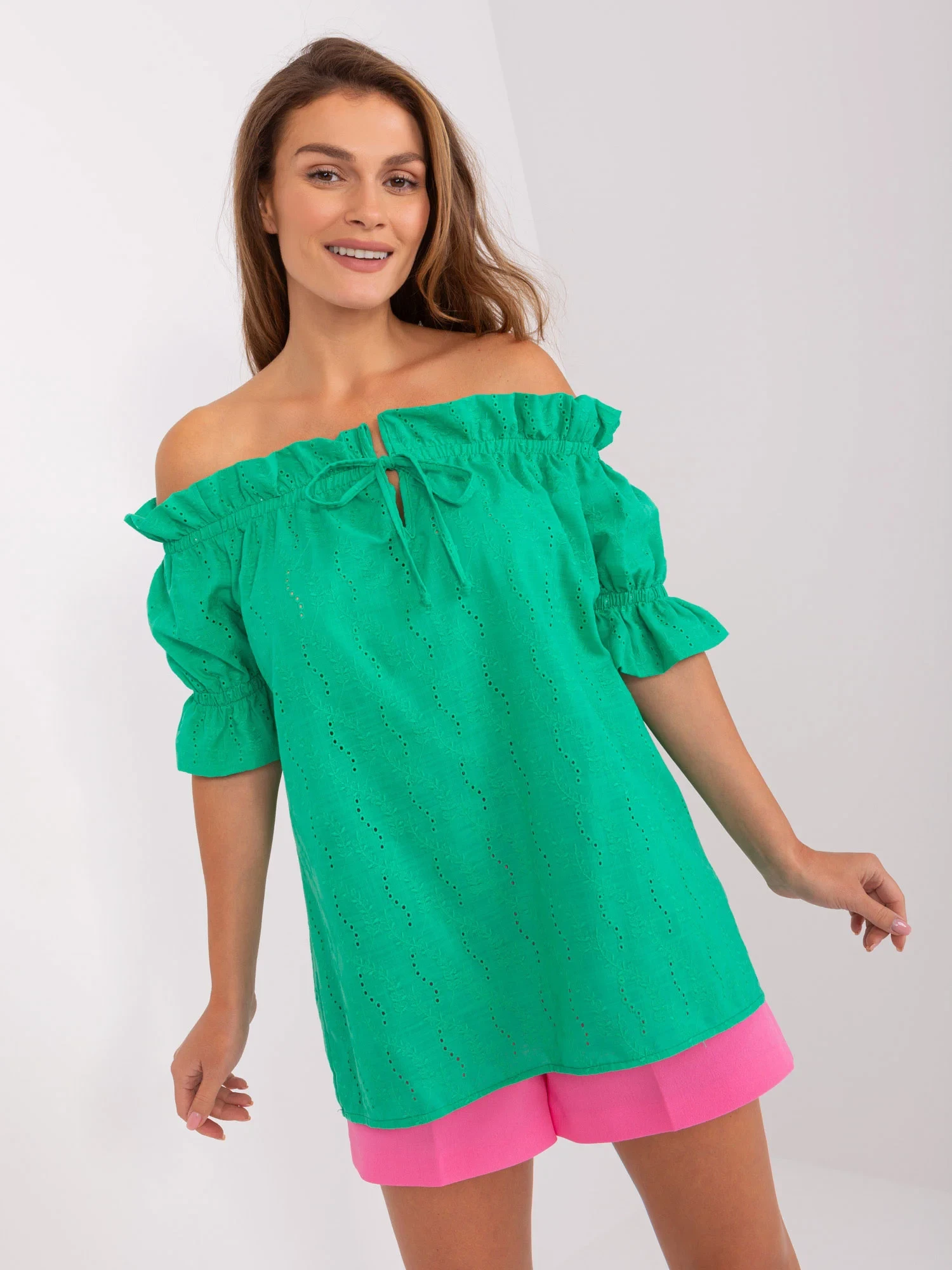 Zelená pruhovaná halenka s krátkými rukávy .