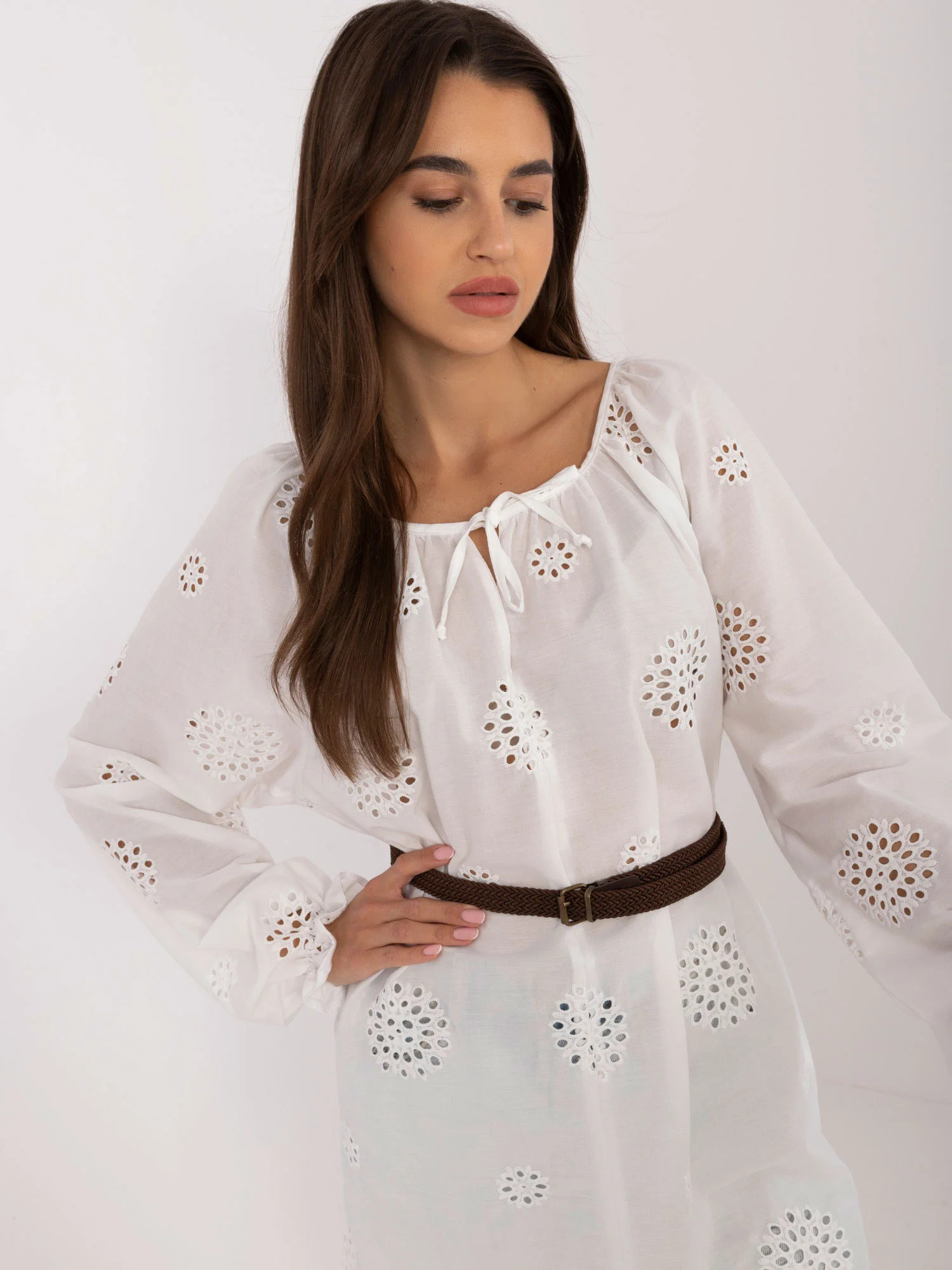 Modelka má na sobě velikost S/M. Rozměry modelky: výška 172 cm, poprsí 88 cm, pas 63 cm, boky 92 cm.