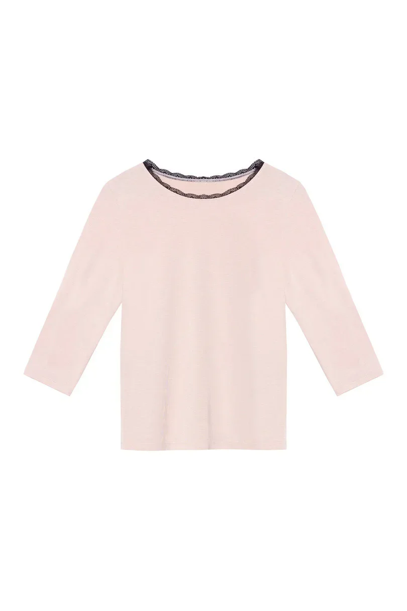Dámská viskózová halenka s 3/4 rukávy, kulatý výstřih zakončený krajkou.