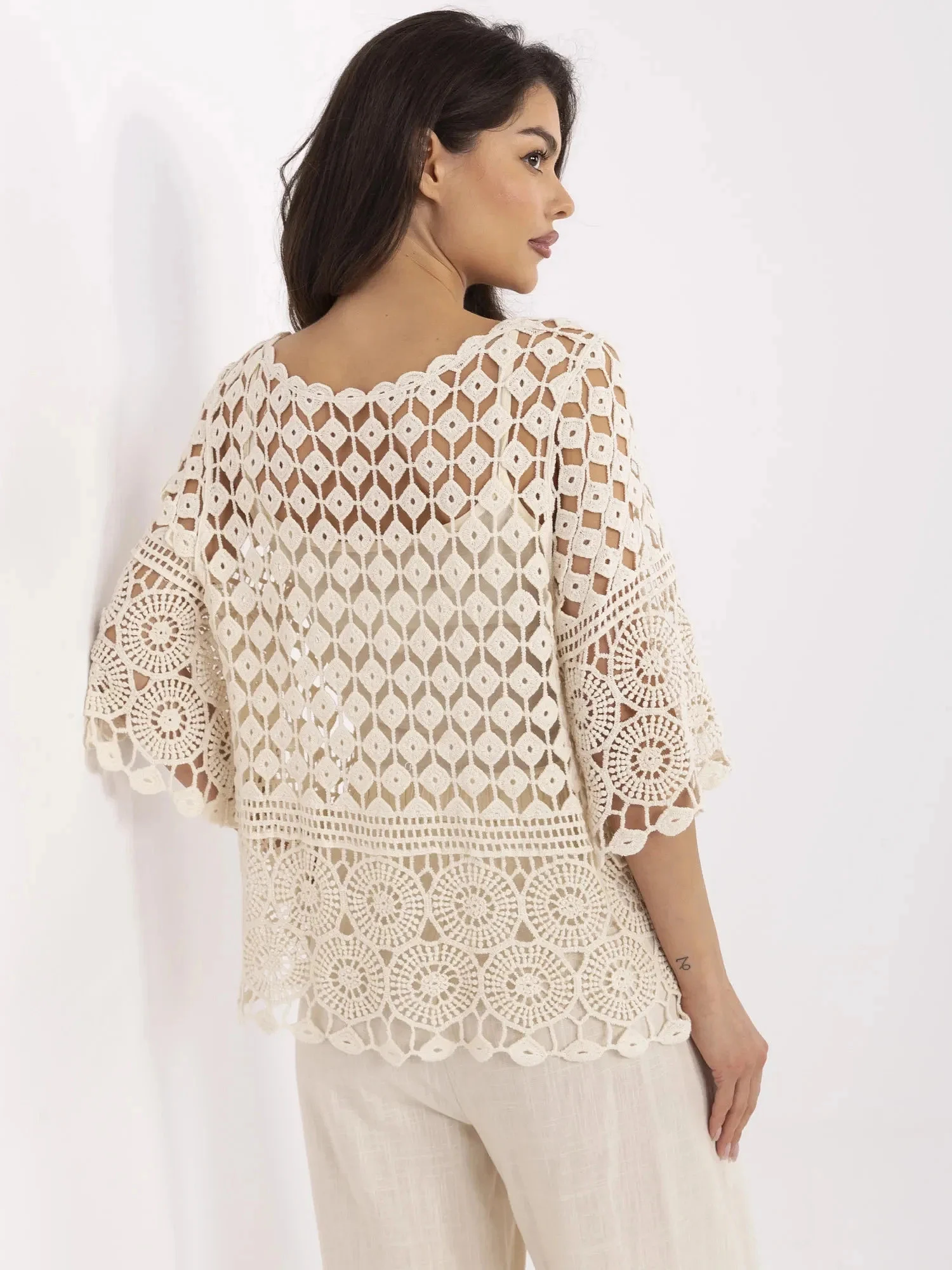 Rozměry halenky v jedné velikosti měřené na plocho: šířka v podpaží - 57 cm délka rukávu - 37 cm (od švu), celková délka - 62 cm, šířka v bocích - 62 cm.