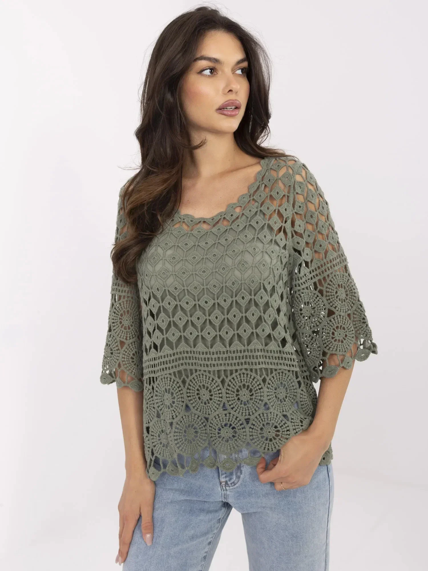 Rozměry halenky v jedné velikosti měřené na plocho: šířka v podpaží - 57 cm délka rukávu - 37 cm (od švu), celková délka - 62 cm, šířka v bocích - 62 cm.