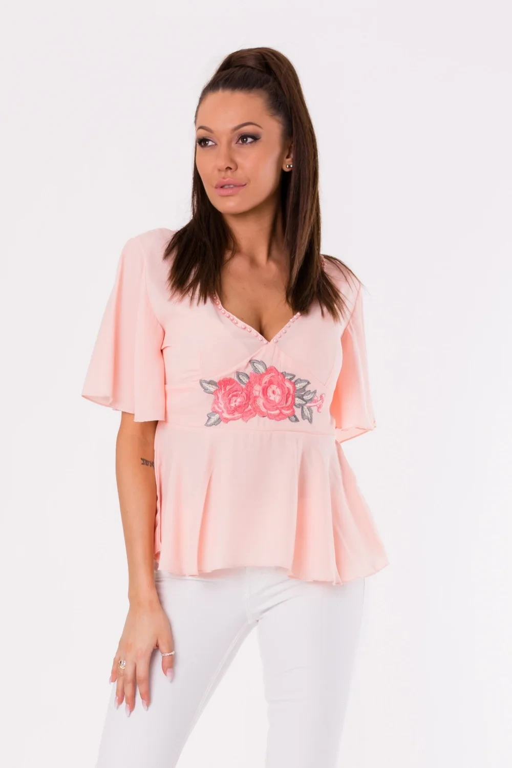 Vzdušná halenka s růží. Halenka má hluboký výstřih a volné rukávy.