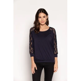 Námořnicky modrá halenka s krajkou podél rukávů, která se skvěle hodí k mnoha stylizacím. Mírně volný střih, velmi pohodlná, měkká, elastická viskóza. 3/4 rukávy, mandlový výstřih, půvabně zvýrazňující ramena. Perfektní návrh na jaro. Elastan 5 %