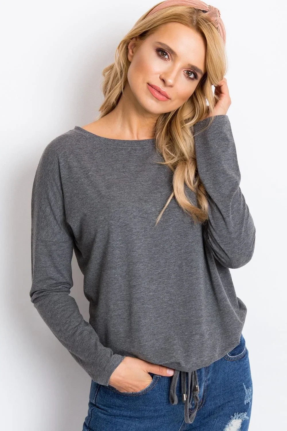 Halenka rovného střihu s dlouhými rukávy. Zavázat dole.