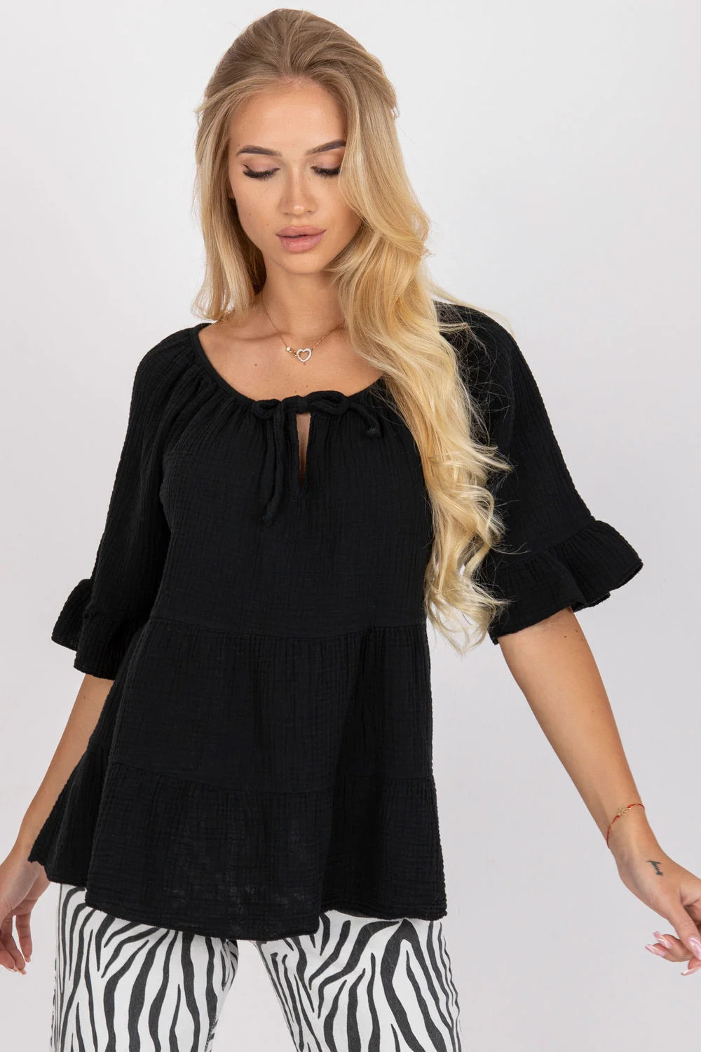 Halenka volného střihu s krátkými rukávy. Zavazovací výstřih, rukávy s volánky. Ideální pro každodenní nošení.