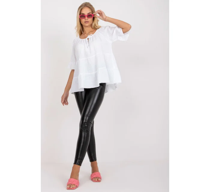 Halenka volného střihu s krátkými rukávy. Zavazovací výstřih, rukávy s volánky. Ideální pro každodenní nošení.