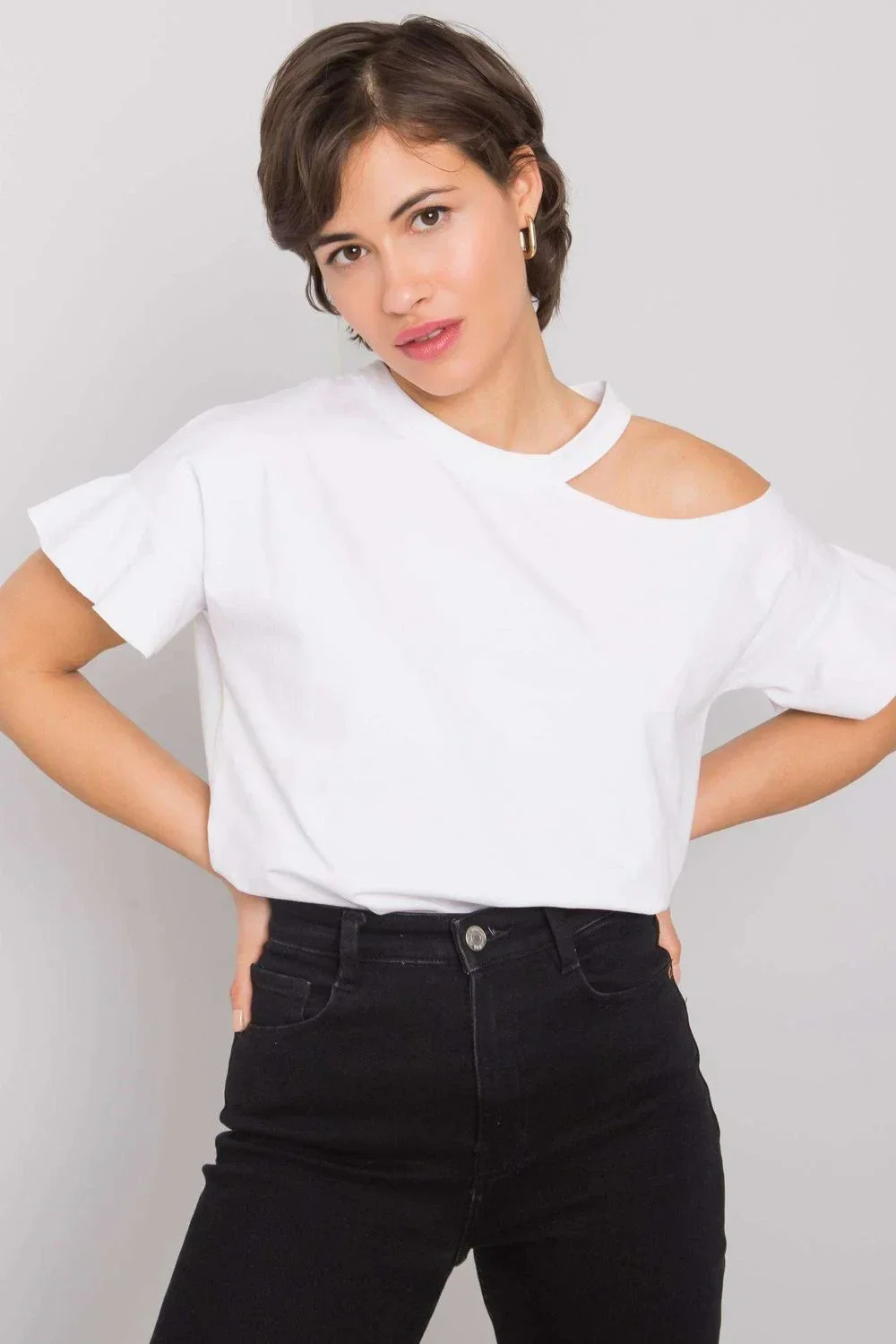 Halenka neobvyklého střihu s krátkými rukávy. Řez odhaluje rameno.