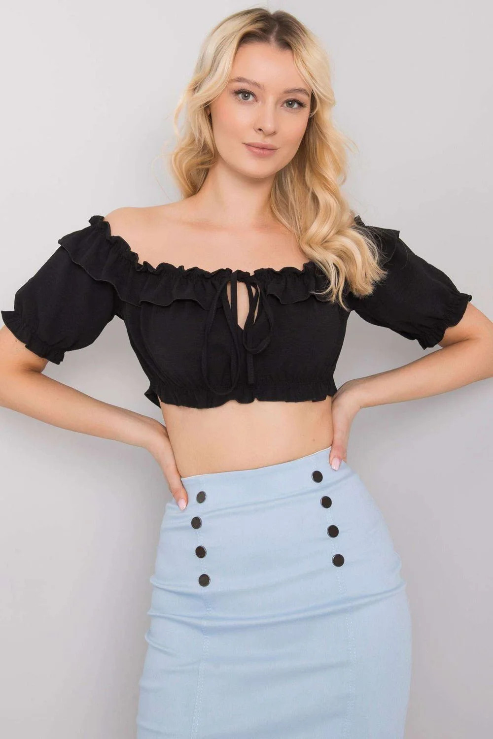 Krátká halenka s výstřihem ve španělském stylu a krátkými rukávy. Zavazování vpředu.